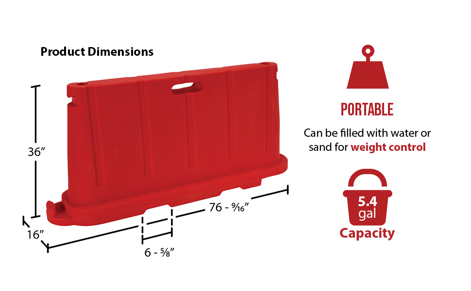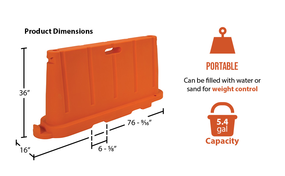 Uses 80% less storage space! Common uses include: Crowd & traffic control, area delineation, security, pedestrian protection, construction worker protection, restrict access to areas, factory & warehouse settings. Standard Features: Material thickness is 0.150" Empty weight is 37 Lb. Colors are consistent with ANSI Z535.1 safety colors Manufactured of virgin polyethylene material with UV stabilizer Overall size is 76-1/2"L X 16"W x 36"H (Effective connected length is 72") Hollow base may be filled with 5.4 gallons of water for added weight (~45 Lb.) Not for highway use.