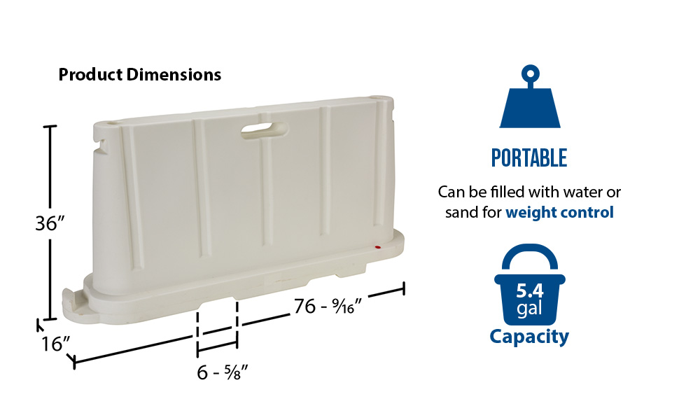 BCD-7636-WH BCD-7636-WHPolyethylene Stackable Barricade 76-1/2 In. x 16 In. x 36 In. WhiteMaterial Thickness (in.): 0.15