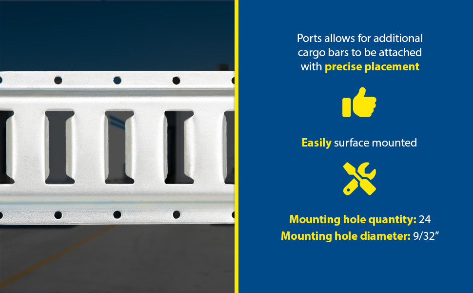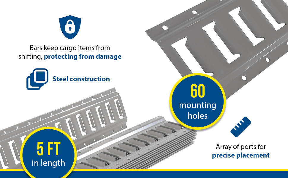 The E-track is a great benefit to shipping and cargo loads. With a steel construction the track allows additional bars to become attached to it. Once, the additional bars are in place the shifting of items becomes minimized. The track design lets the user choose from an array of ports for precise placement. E-TRACK Cargo Bar Assist Tool also available.