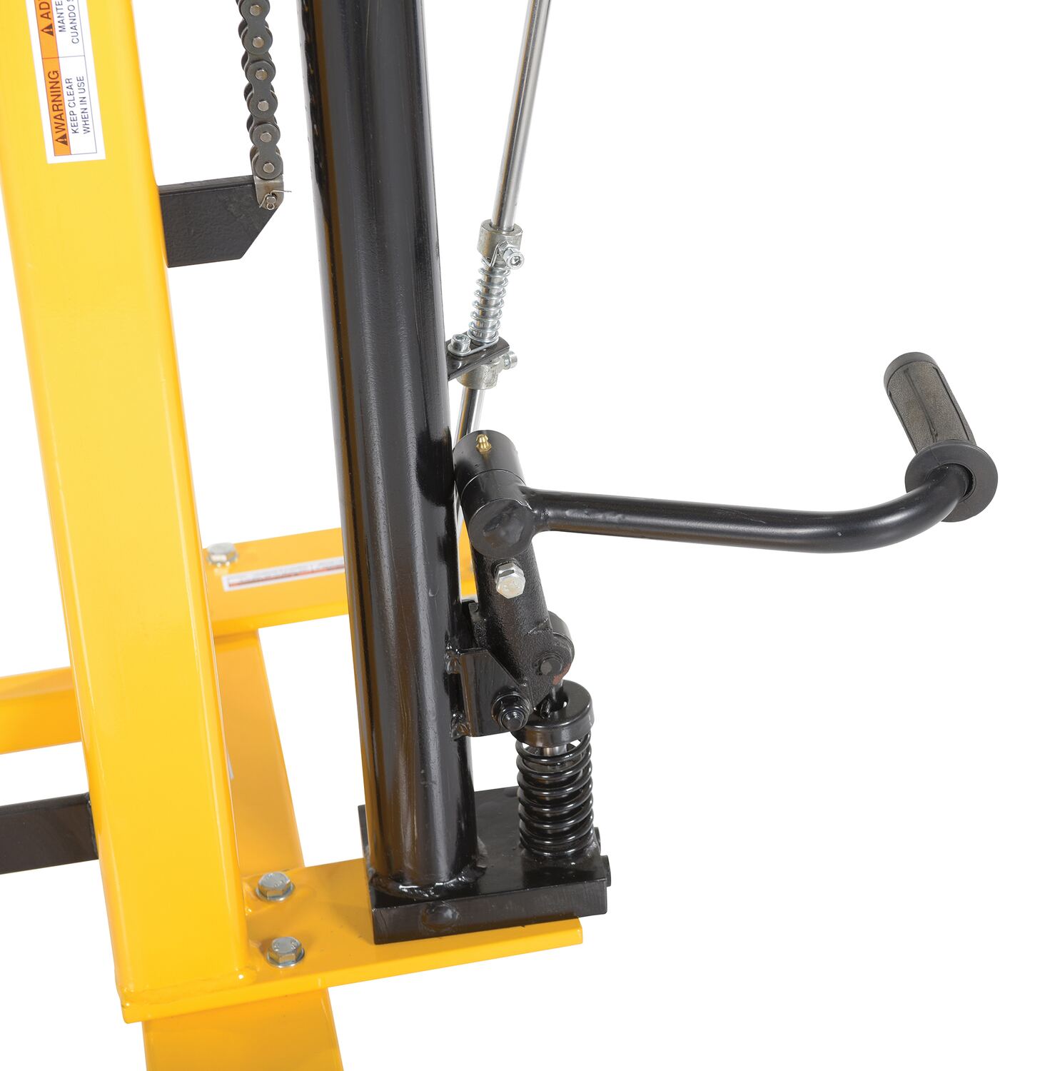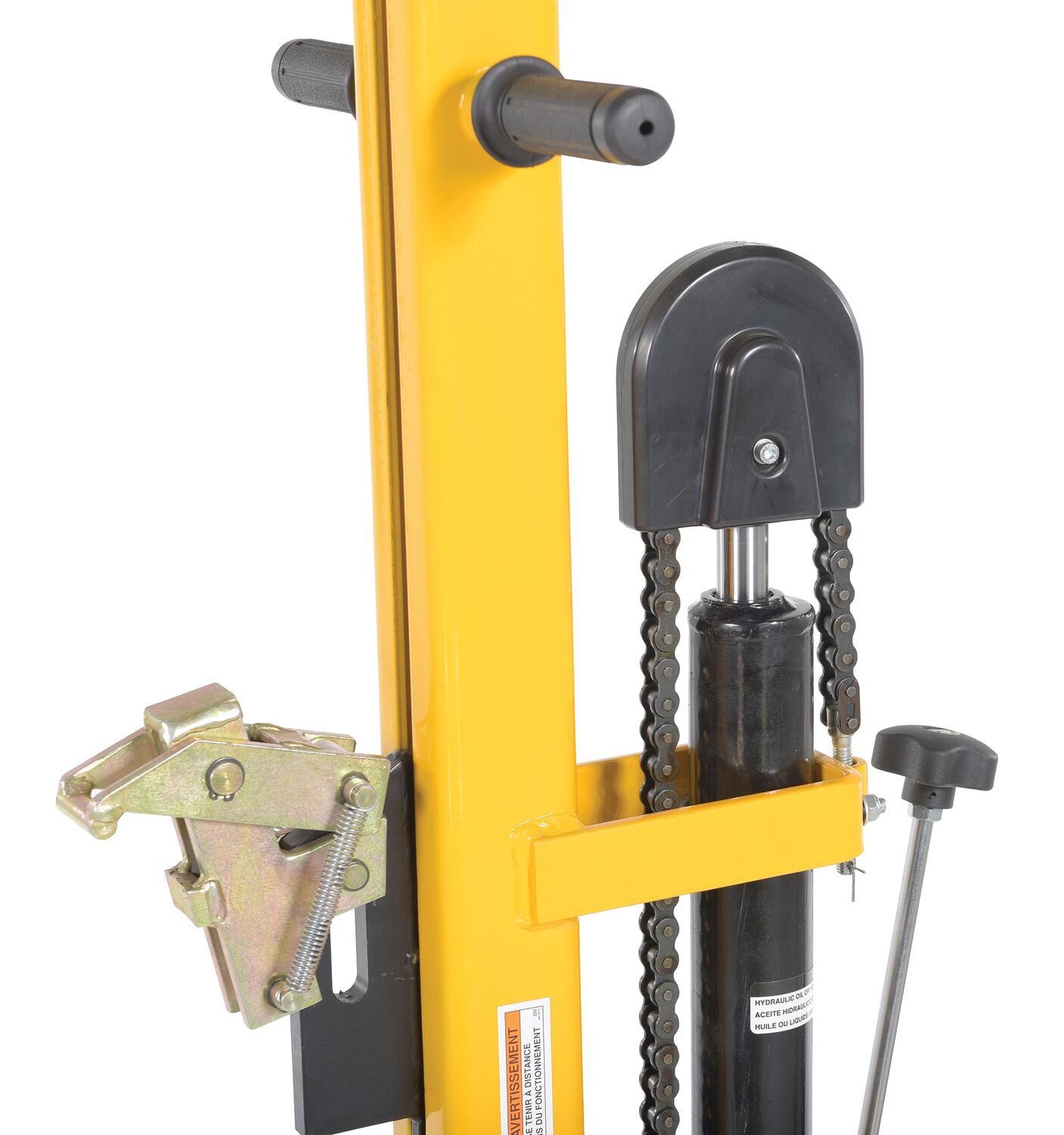 • Manual low profile hydraulic drum truck transports and positions drums efficiently
