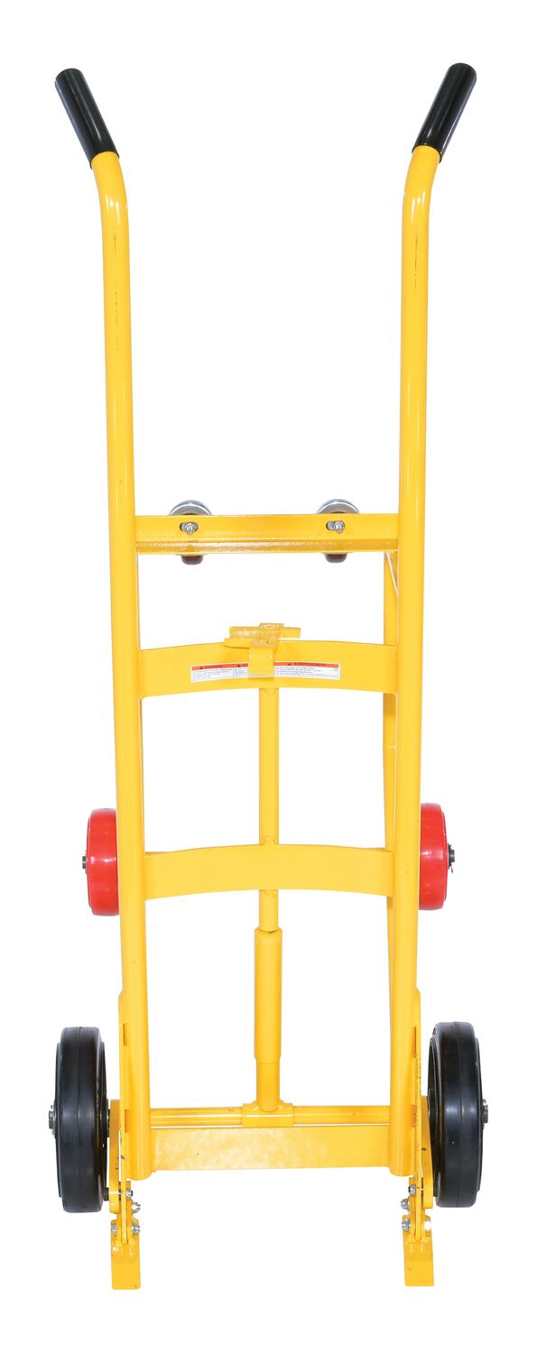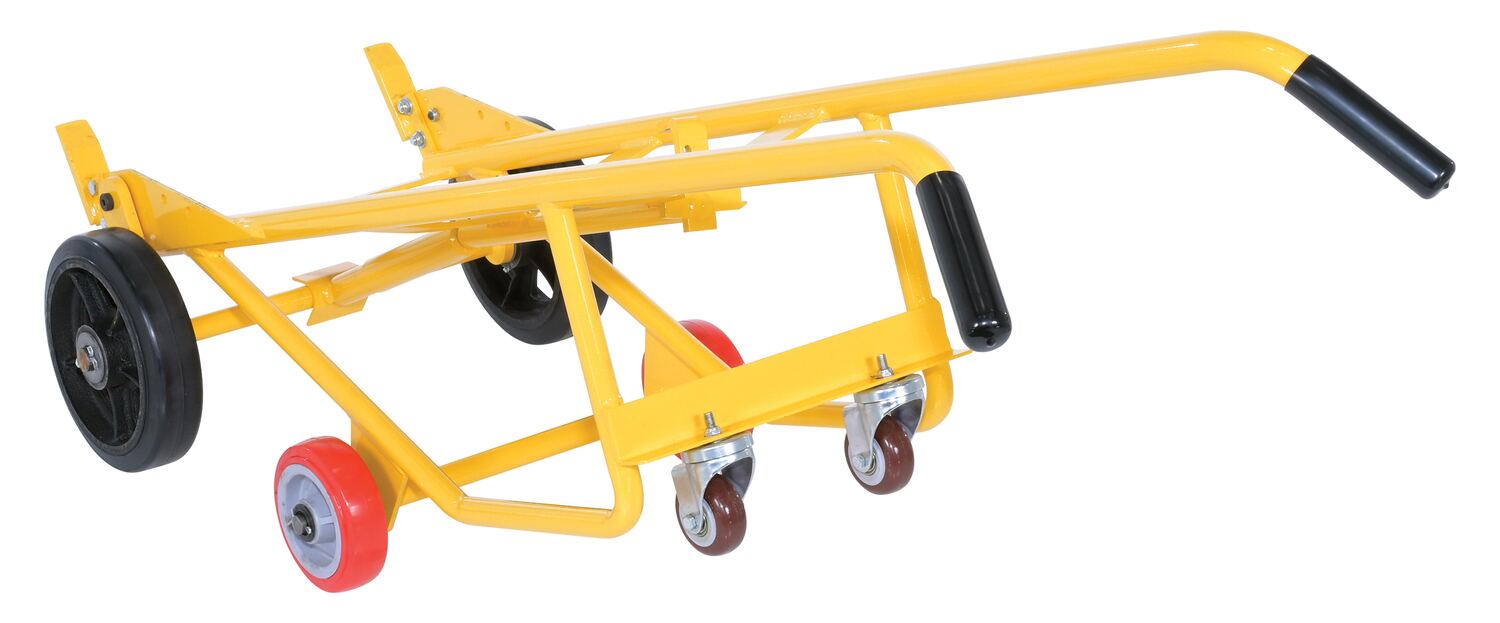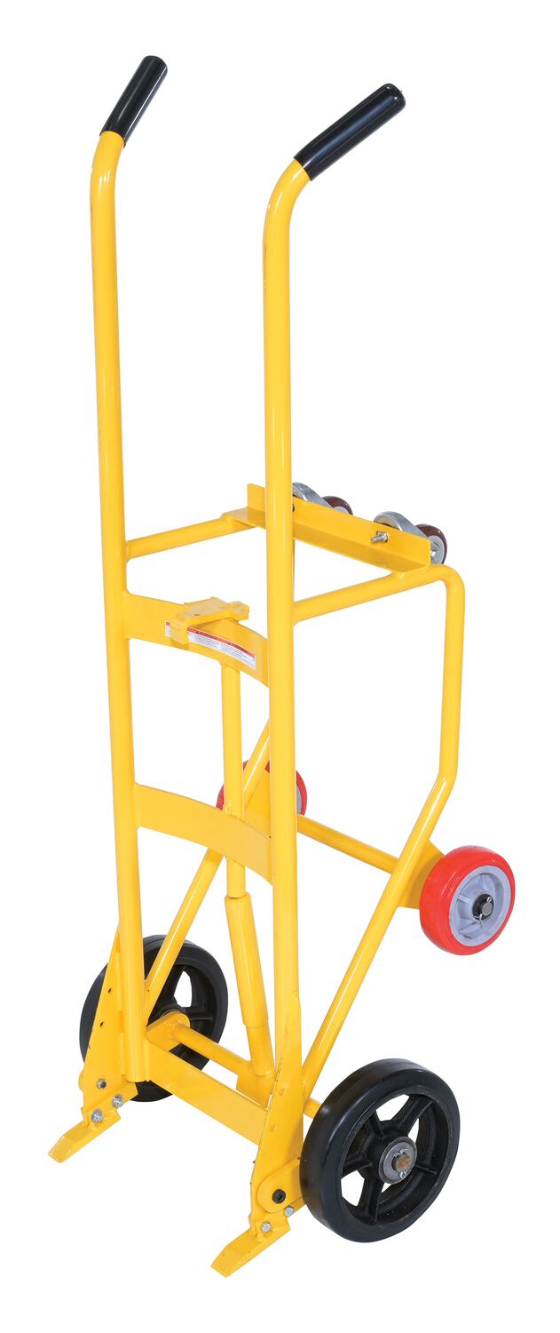 One of the most versatile drum trucks in the industry. This innovative product allows the operator to easily tip back the truck in order to transport drums ergonomically on four wheels. Unit doubles as a drum cradle for storage and dispensing all in one. Top angle is 3 degrees when used as a Drum Cradle. This unique design also allows the operator to place drums and retrieve off of a pallet. Accommodates 55-gallon steel, plastic, or fiber drums. Rolls smoothly on a variety of (2) 10" x 2-1/2" wheel types (see table below), (2) 6" x 2" poly-on-poly wheels, and (2) 3" x 1-1/4" poly-on-poly swivel casters. Standard with a wheeled undercarriage that positions the drum horizontally for drainage or storage. The drain height is 12-13/16" high in the cradle position. An integral self-storing bung wrench is standard. This attractive feature not only opens numerous drums, but helps to keep the drum snug on the truck. A yellow baked in powder coat finish for added toughness. Optional drip pan available.