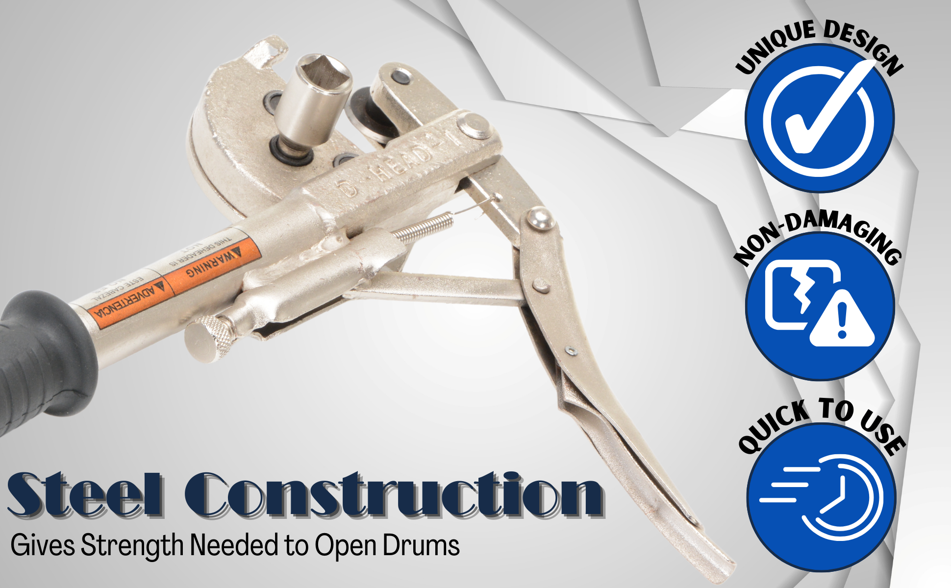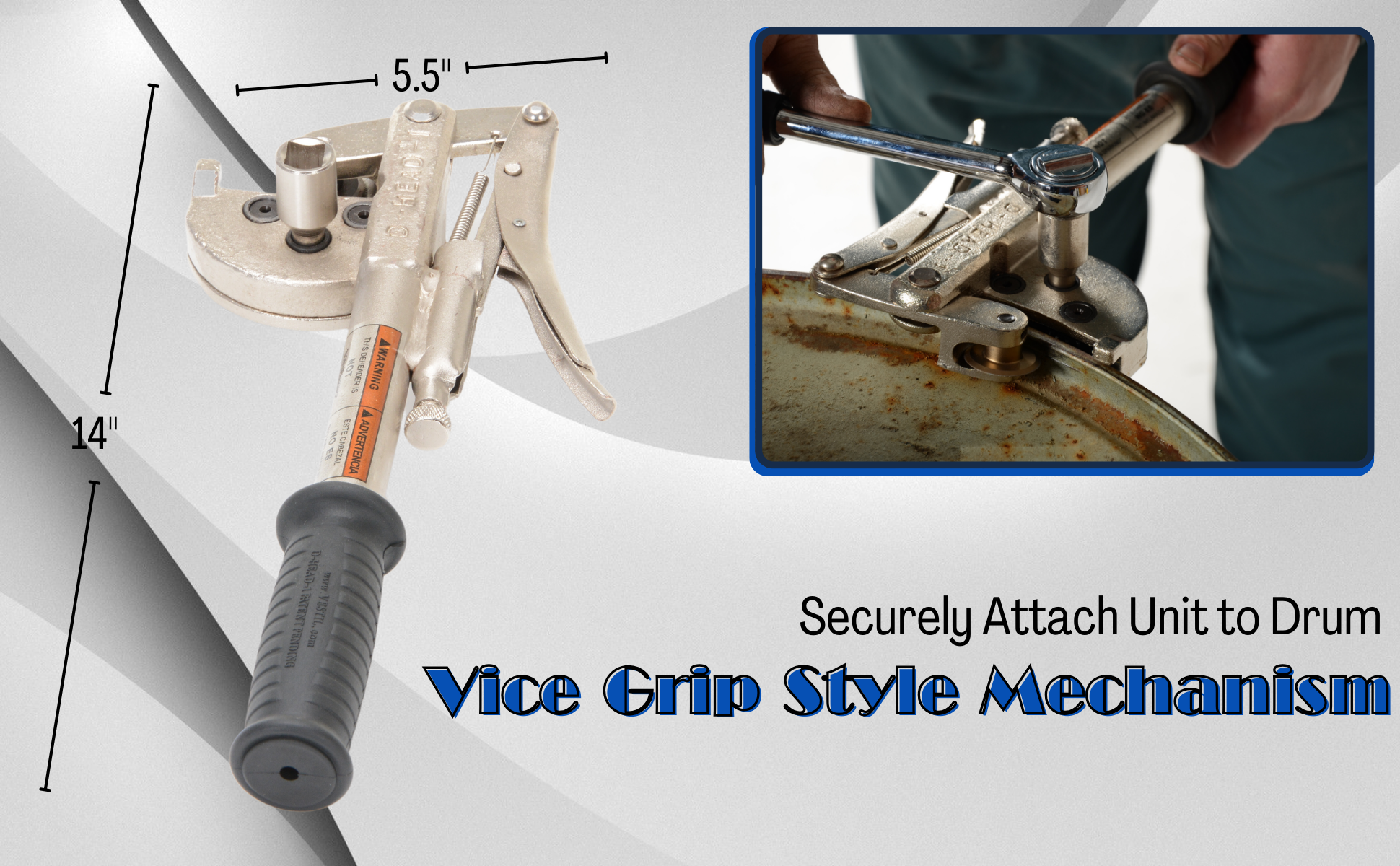 WARNING: Improper use of this drum deheader might result in personal injury or damage to the deheader. DO NOT use a pneumatic or electric impact wrench to operate the deheader ratchet. Replacement blades available separately, model D-HEAD-B. Both styles open 30 and 55 gallon steel drums and 5 gallon pails.