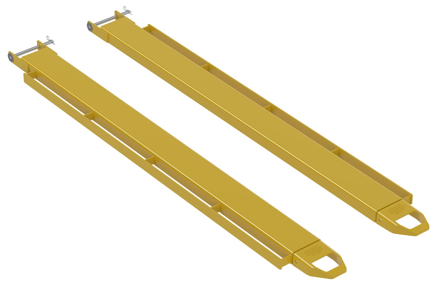HOW TO USE / INSTALLATION Remove pin and lay extension over fork or drive fork truck into the extension. Re-insert the pin behind the heel of the fork to secure extension. Currently this design is only available in 'pin style'. To be used with class 2 and class 3 forks only Check Out Vestil's Other Fork Extension Styles: