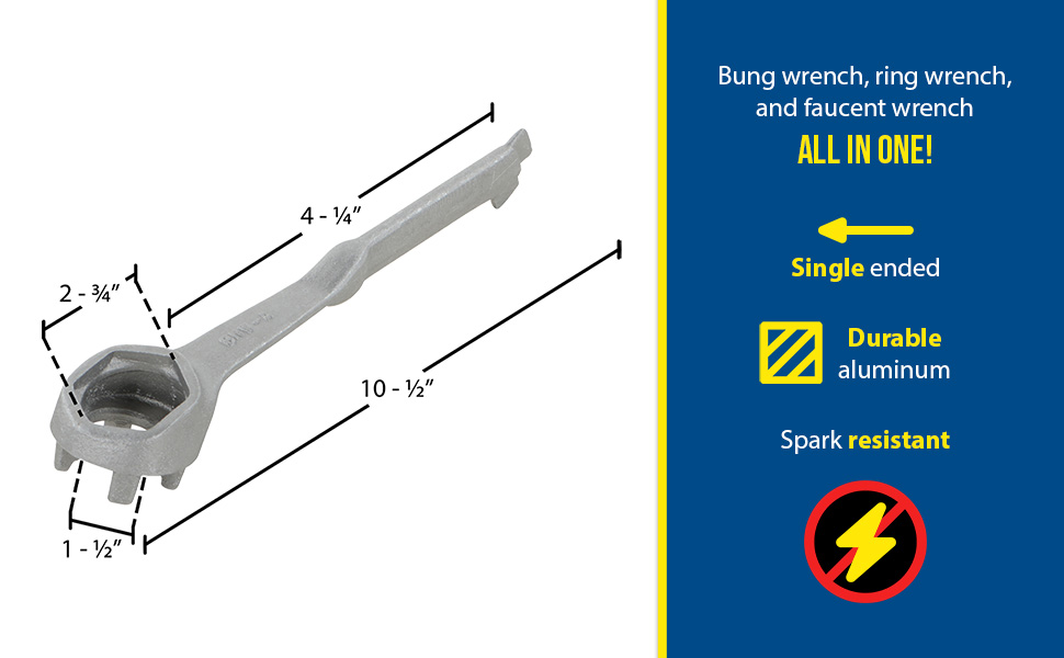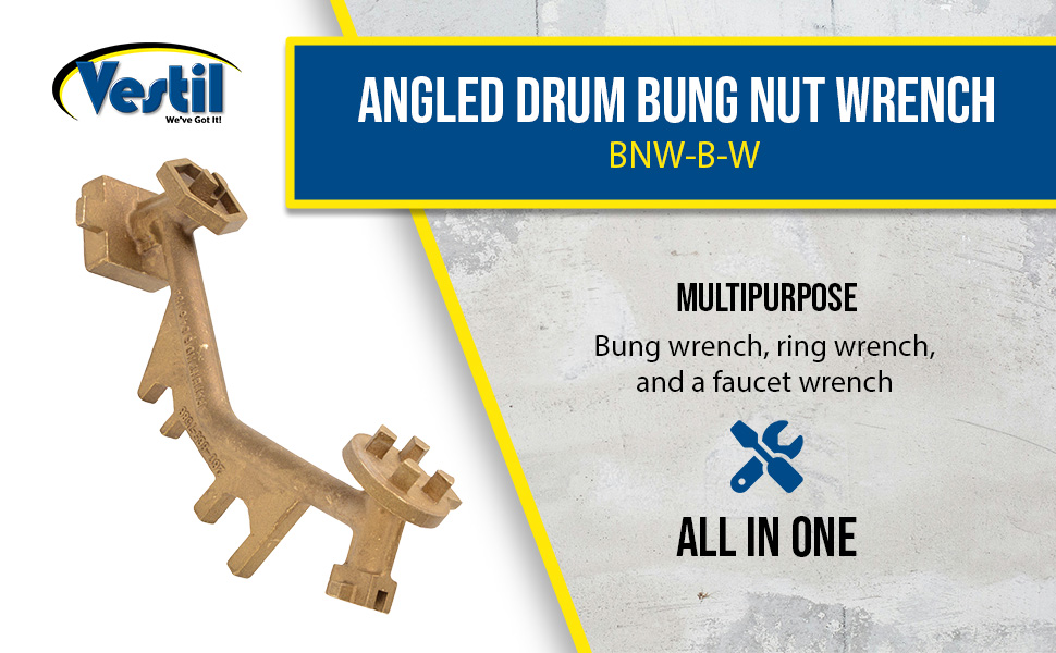 Specialty Bung Nut Wrenches are available in cast steel with polished zinc finish, non-sparking aluminum or non-sparking bronze alloy to meet many applications. These multipurpose drum tools not only open and close drum bungs or plugs, they also work as a bung wrench, ring wrench and faucet wrench all in one! Wrenches are universal in which they fit all types of industrial drum plugs and bungs in metal or plastic. The angled handles on model BNW-I-W and BNW-B-W protect knuckles in most positions. Durable cast steel does not bend, break or chip. Eliminate the need for extra tools with these multifunctional drum wrenches! Patent pending.