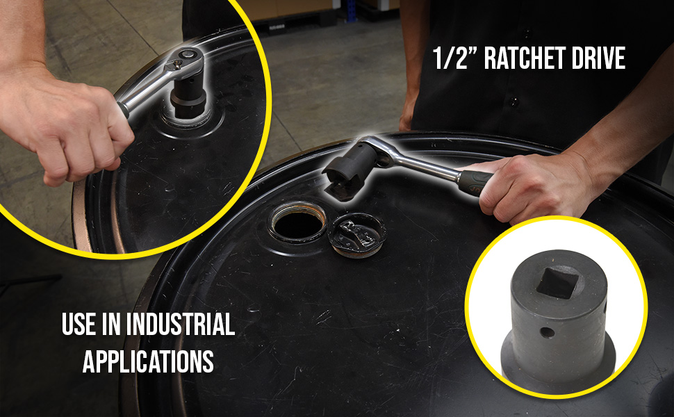 Designed for opening and closing 2" and 3/4" drum plugs. Use with a 1/2" ratchet drive. Manufactured from heat treated chrome vanadium steel for strength when using with pneumatic impact driver. Works with several 3/4" and 2" drum plugs, see illustration.