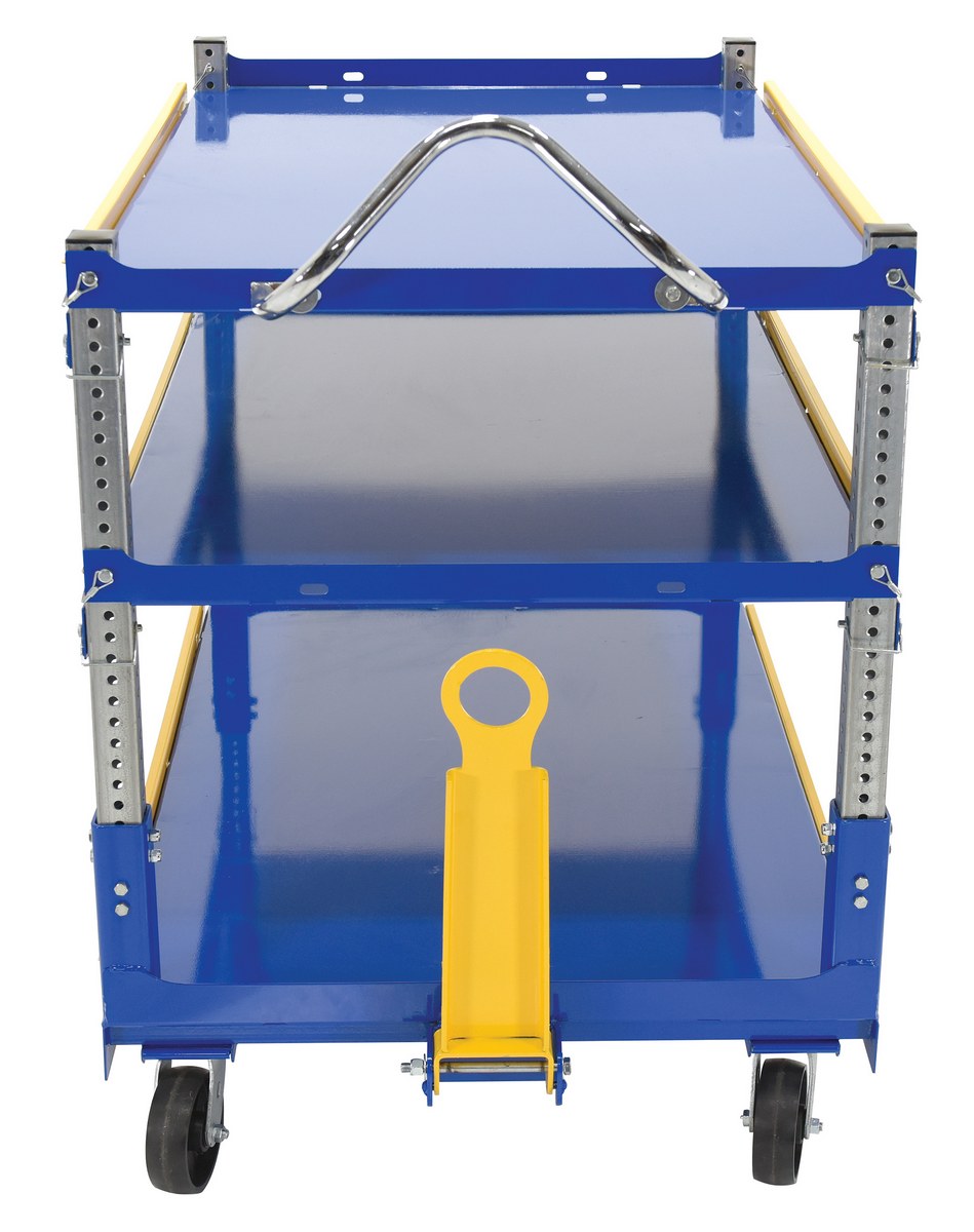 The adjustable ergonomic cart is the perfect asset to a number of facilities including shipping and handling to hospitality. A strong construction with a tall handle diminishes bending and twisting while loading and unloading products. The top two tiers can be adjusted in height with a simple pull of a pin to let larger sized products be transferred securely. The unit rolls on the users choice of glass-filled nylon or mold-on rubber casters for a smooth transition.