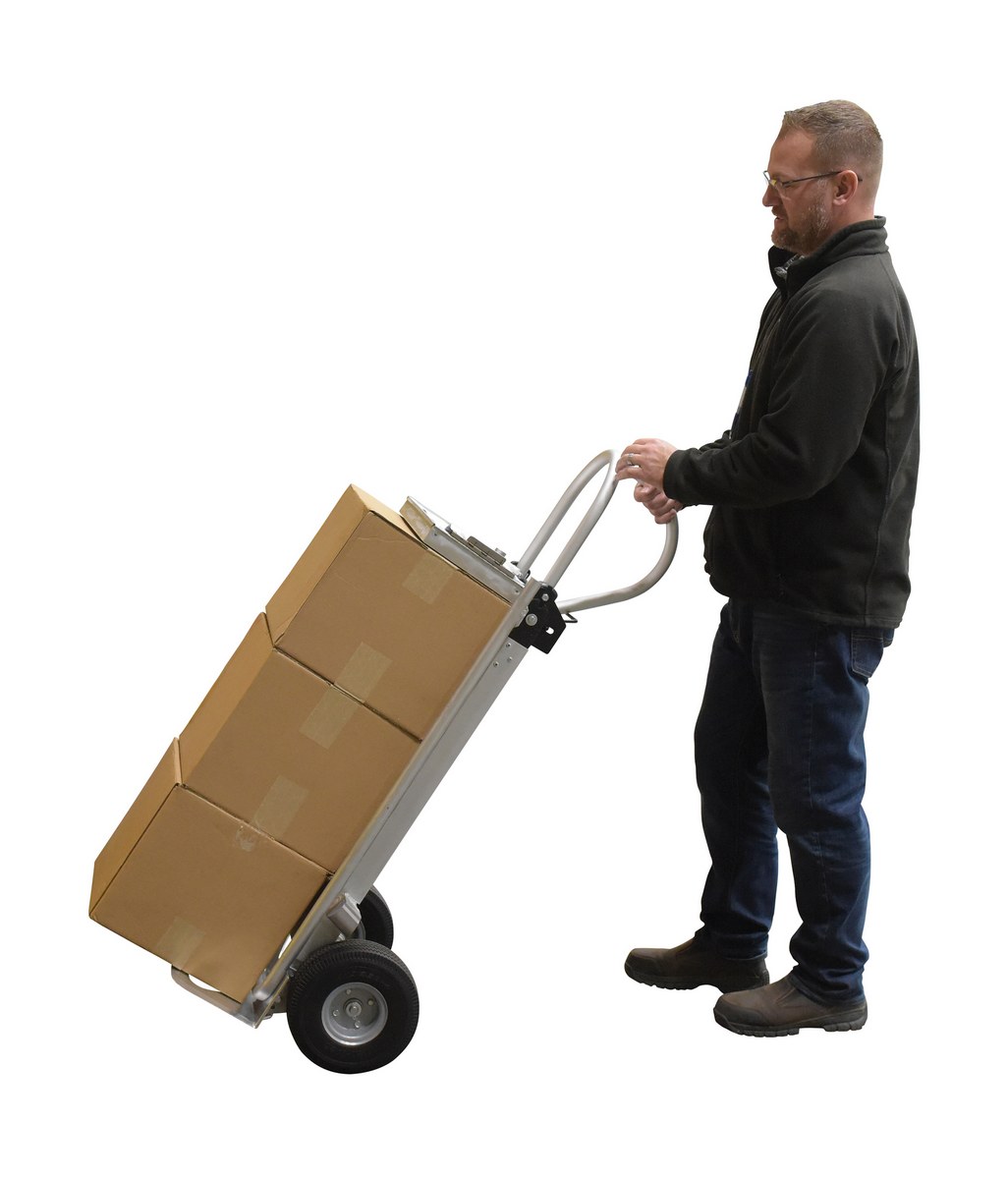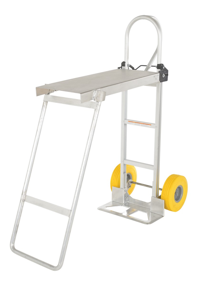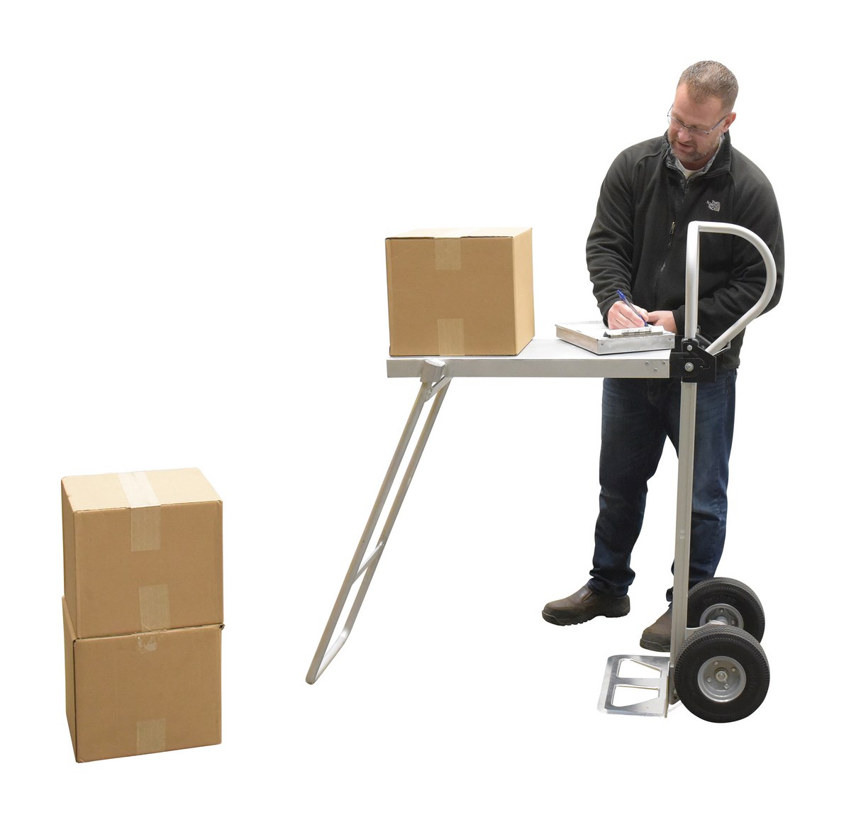 This lightweight aluminum hand truck features an integral work bench. Work bench conveniently folds flat for storage. Now a sturdy work bench can be moved to where it is needed most. Provides for a more comfortable and ergonomically correct work position. P-handle design allows for easy maneuverability.