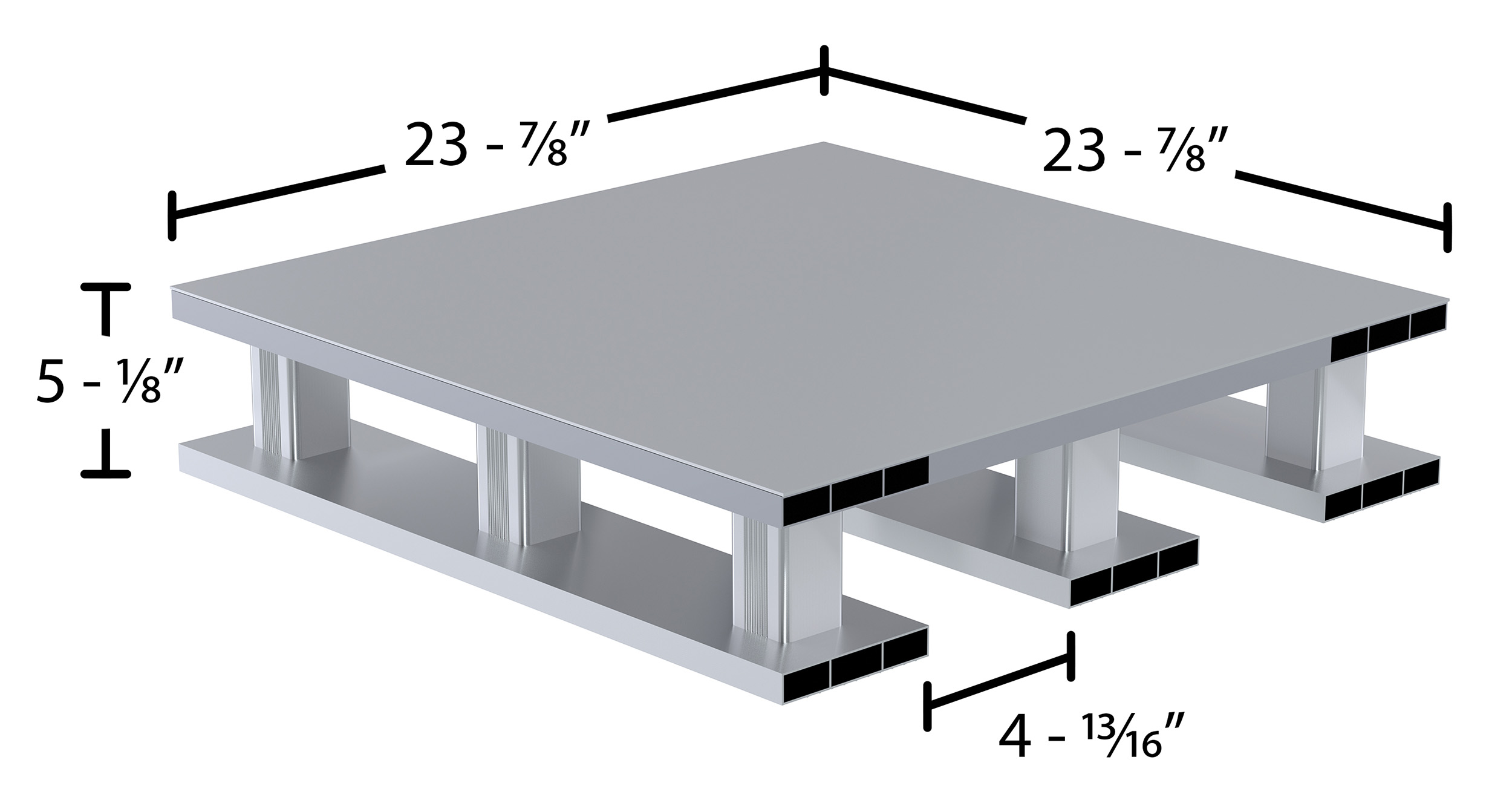 Aluminum Half Solid Top with Skid Bottom 23-7/8 In. x 23-7/8 In. x 5-1/8 In. 4000 Lb. Capacity SilverAn Aluminum half pallet is a great asset for a variety of industries. With the half pallet design, items can be chosen and fitted to a pallet much closer to their size. This utilizes and maximizes space during shipping and floor space during any storage. The solid top design enables quick and simple cleaning, while the skid bottom provides quick access.