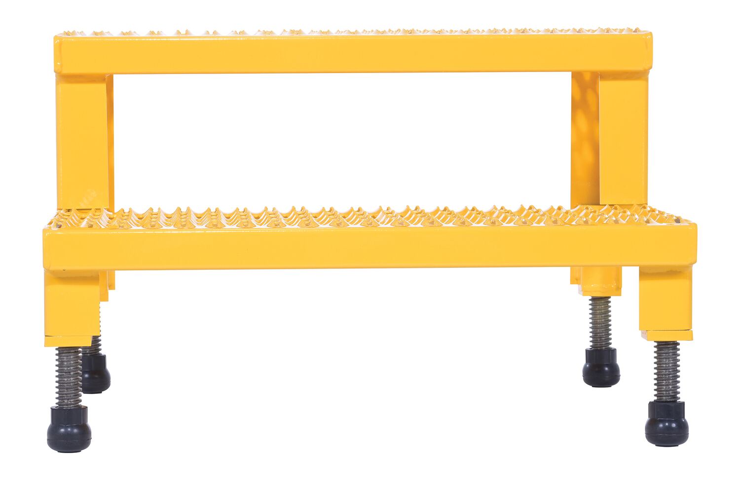 Steel Adjustable Step Mate Stand 2 Step 22-7/8 In. x 23-13/16 In. x 15-1/4 In. 500 Lb. Capacity YellowThe adjustable step-mate stand can be used as either a comfortable worker platform or a semi-permanent step. The serrated surface ensures safe footing. The legs adjust individually by screwing them into or out of the leg base.