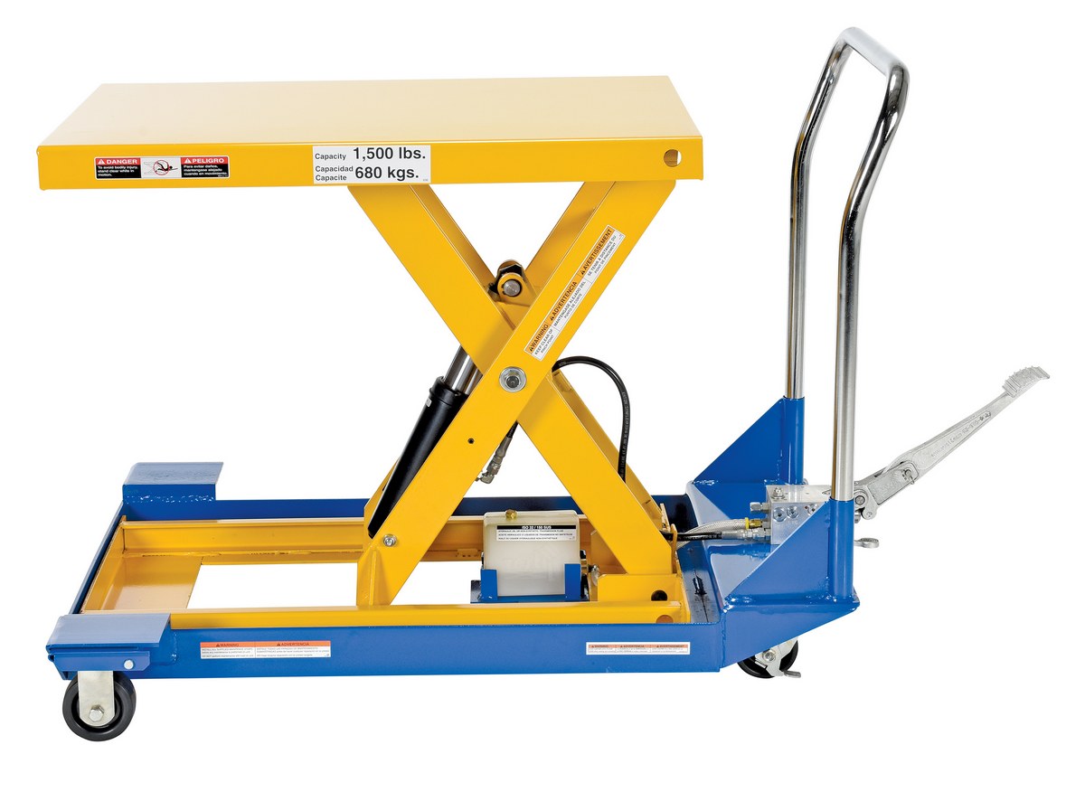 Steel Foot Pump Scissor Cart 36 In. x 24 In. 1500 Lb. Capacity Blue / YellowThe manually powered Scissor Cart table provides an unparalleled support in lifting, palletizing, loading, and unloading applications. The cart is raised or lowered with a manual two-speed foot pump. The unit rolls smoothly on two rigid and two swivel phenolic casters with brakes. The push handle is removable. Features an internal safety velocity fuse in each cylinder.