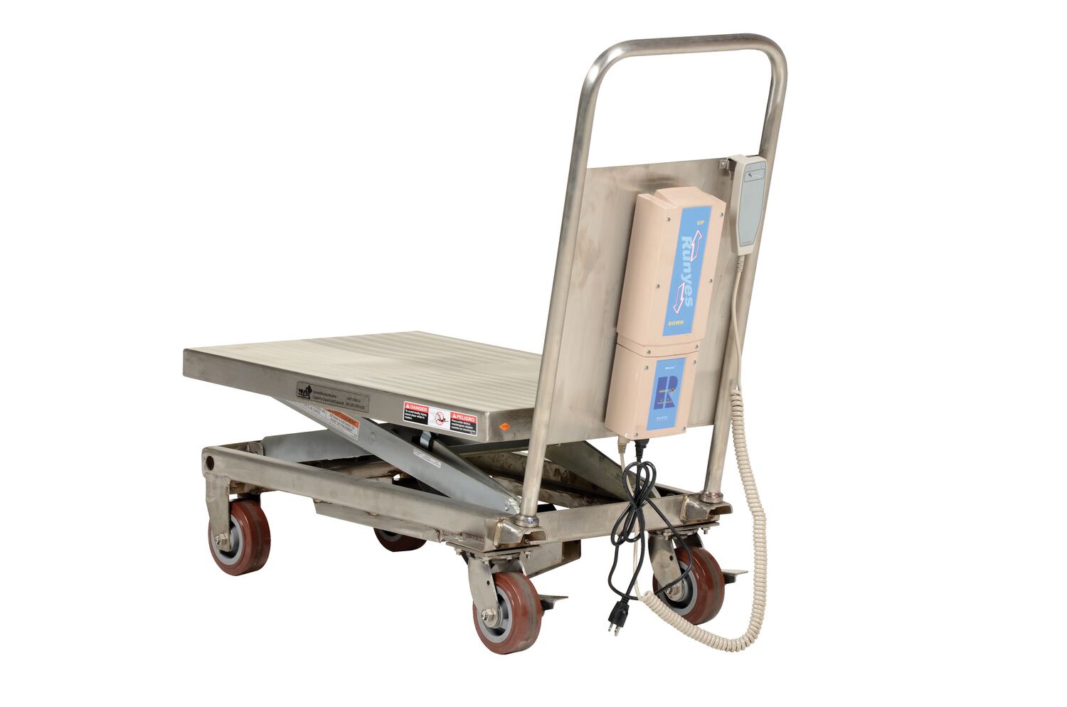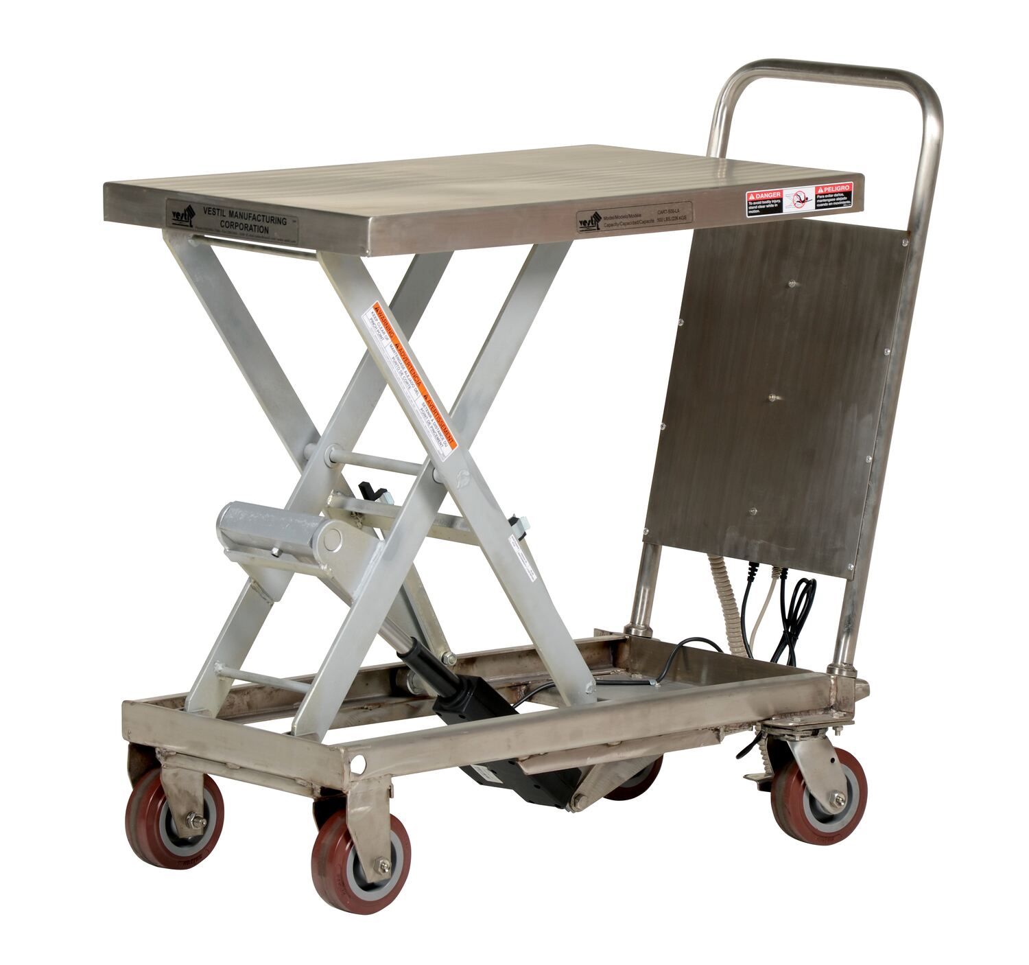 The linear actuated elevating cart transports materials from workstation to workstation with ease. The platform is raised and lowered with an electric linear actuator for precise positioning. Linear actuator will not allow platform to drift down- a common problem with hydraulic carts. This linear actuated cart is powered with a DC battery and features an on-board charger. A hand held pendant control connects to power unit with a coil cord. The units rolls smoothly on two rigid and two swivel casters. The platform, handle, base frame, caster brackets, and hardware are stainless steel. The scissor legs are zinc-plated. Battery pack, charger, and hand control are plastic. The linear actuator is plastic with a chrome-plated piston, while the wheels are poly-on-poly. Features an internal safety velocity fuse in each cylinder.