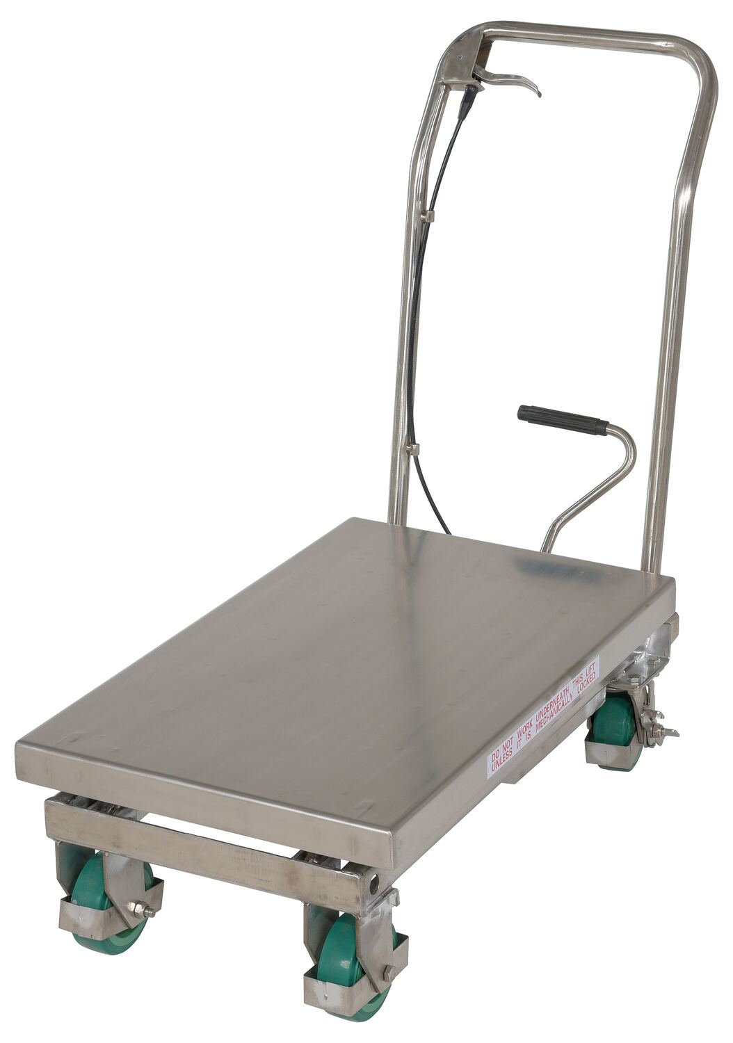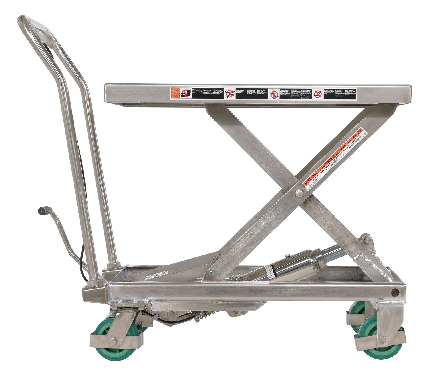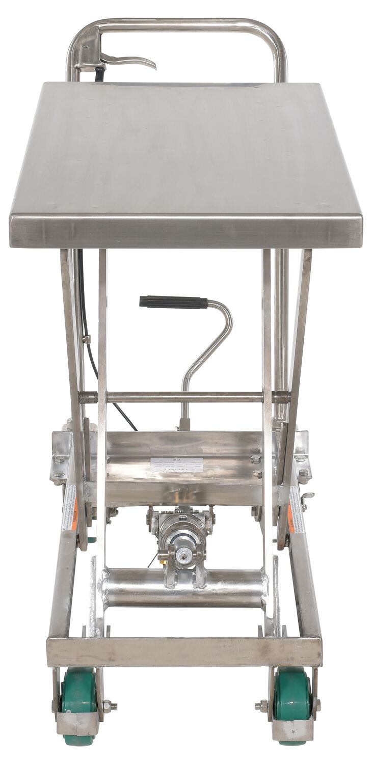 The premium scissor lift cart is constructed of heavy duty steel and designed to withstand the most demanding industrial environments. The simplicity and compactness of these products make them ideal for lifting and transporting loads, order-picking, die handling, and for use in support of assembly operations. There is little exertion required to maneuver the deck due to the high quality foot-actuated, single speed hydraulic pump for raising . A unique tilt-up table top allows for safe and easy maintenance.