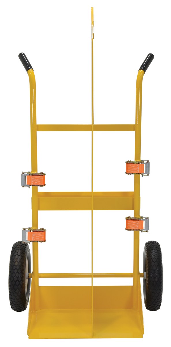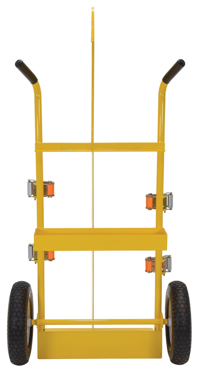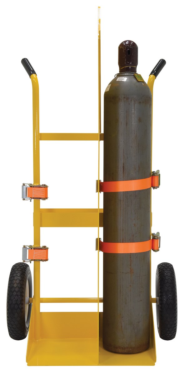 The welding Cylinder torch cart is designed for transporting cylinders and cutting torch. Includes two (2) tank compartments with heavy-duty ratchet straps. Convenient open-top storage tray. Sturdy handles and large wheels for tilt-n-go portability. Welded steel construction with powder coat finish. Not designed for use as a storage means for gas cylinders.