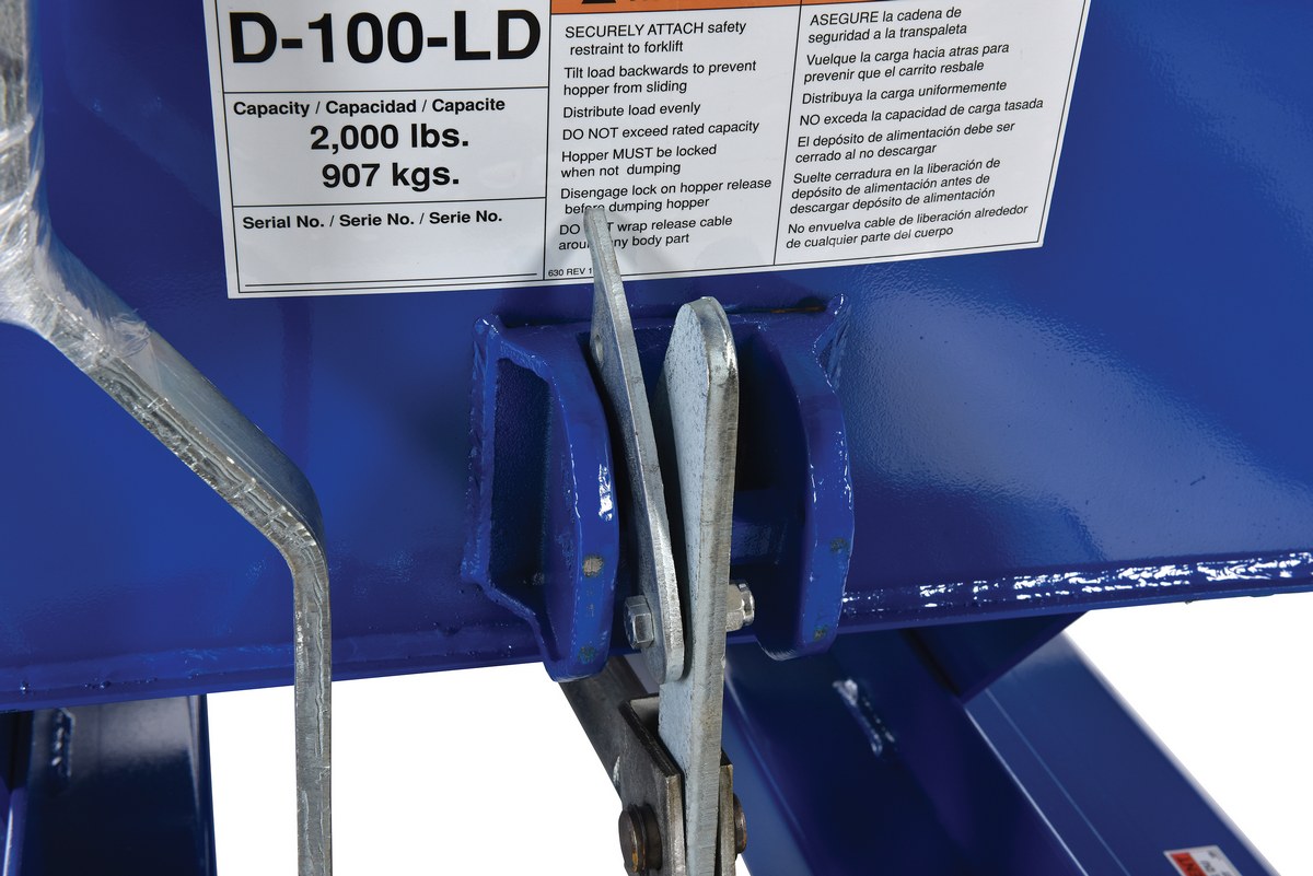 This Light Duty self-dumping steel Hopper with bumper release automatically dumps when bumper release contacts the front of the dumpster. Hopper returns to an upright and locked position automatically after it dumps. Also includes a cable that may be operated from the seat of the fork truck to manually dump the hopper. The included safety restraint should be properly secured to a fork truck before dumping. (Length dimension is measured at top of chute.) Hopper is stackable if you stack the top hopper turned ninety (90) degrees from the bottom. Self-dumping hoppers facilitate compliance with OSHA general industry rule 29 CFR 1910.178(m)(5)(iii) by allowing lift truck operators to remain at the controls of their truck throughout the dumping process.