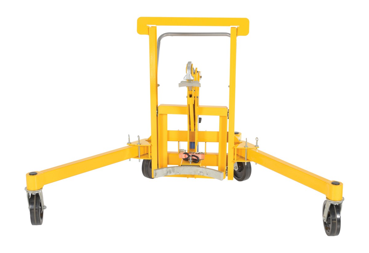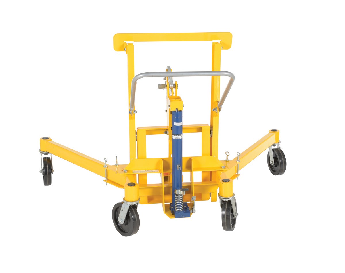 Steel Economical Foot Pump Drum Transporter 55 Gallon 1500 Lb. Capacity YellowUnique portable economical drum transporter is designed to lift and transport drums with a top lip. Steel jaw securely grips the top lip of the drum. Foot pump lift mechanism. Straddle legs rotate for access to drums on pallets. The push handle folds down for easy access to the foot pump.