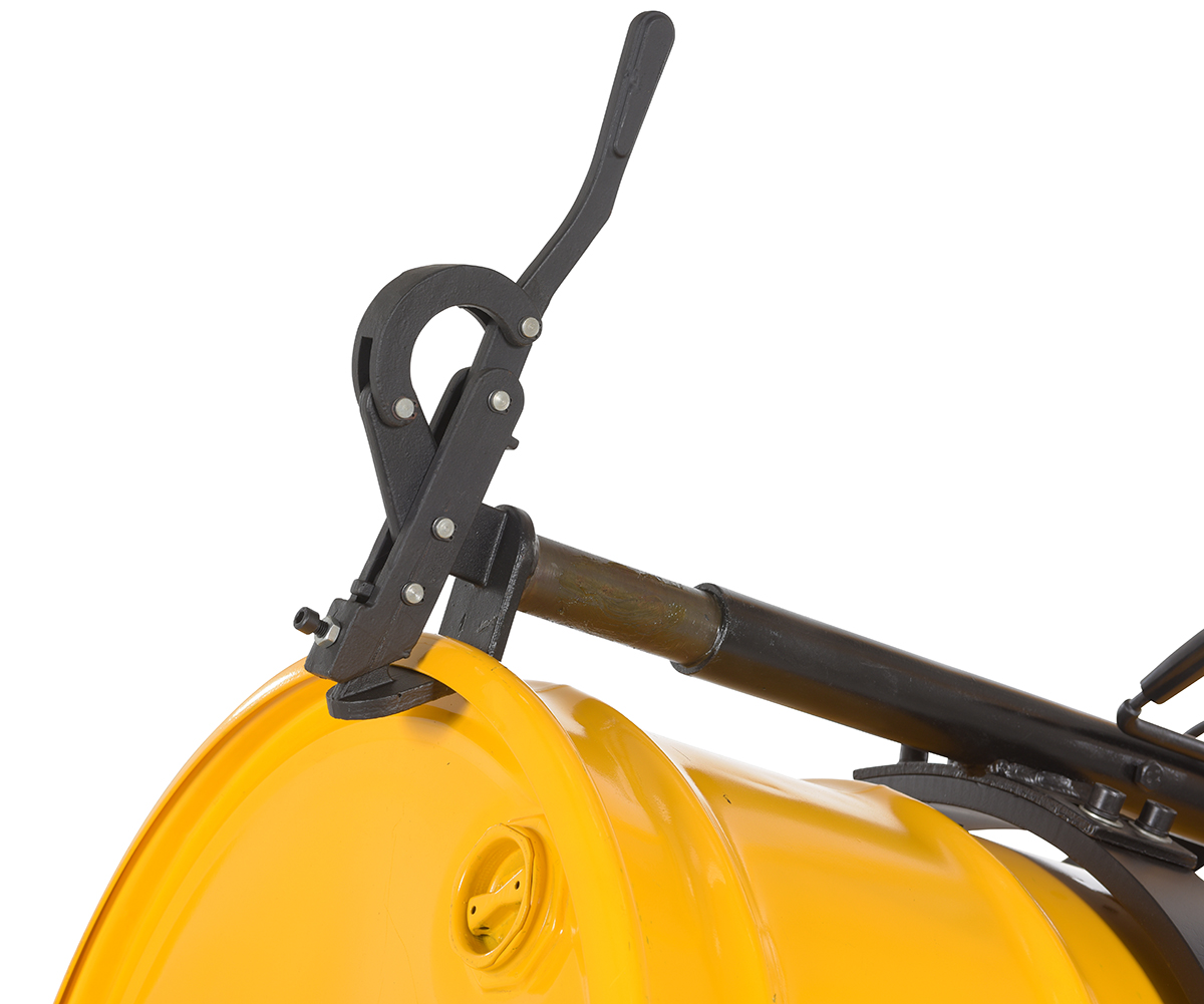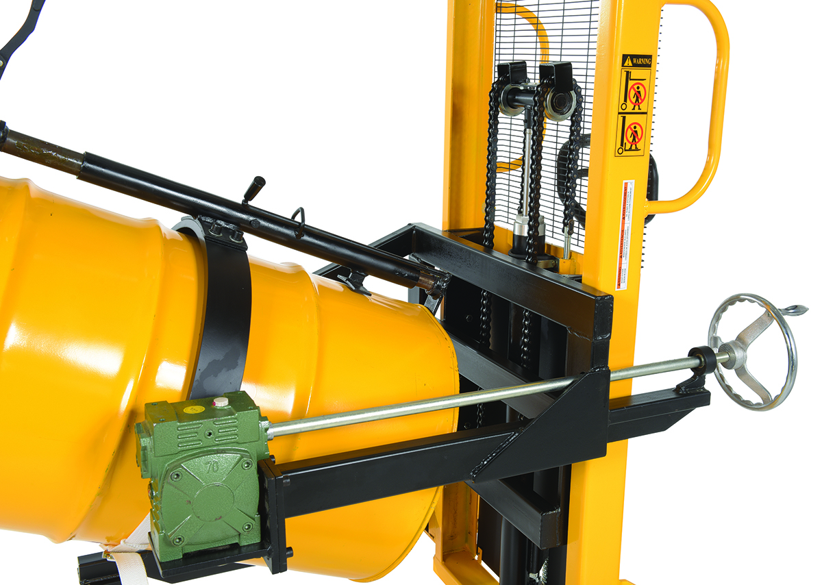 Steel Manual Drum Lifter/Rotator/Transport 51-1/2 In. x 34 In. x 82-5/8 In. 550 Lb. Capacity Yellow/BlackThe manual operation, portable Drum Lifter/rotator/transporter features pivoting straddle legs for access to drums on pallets. Legs will manually pivot and lock into place with locking pin.