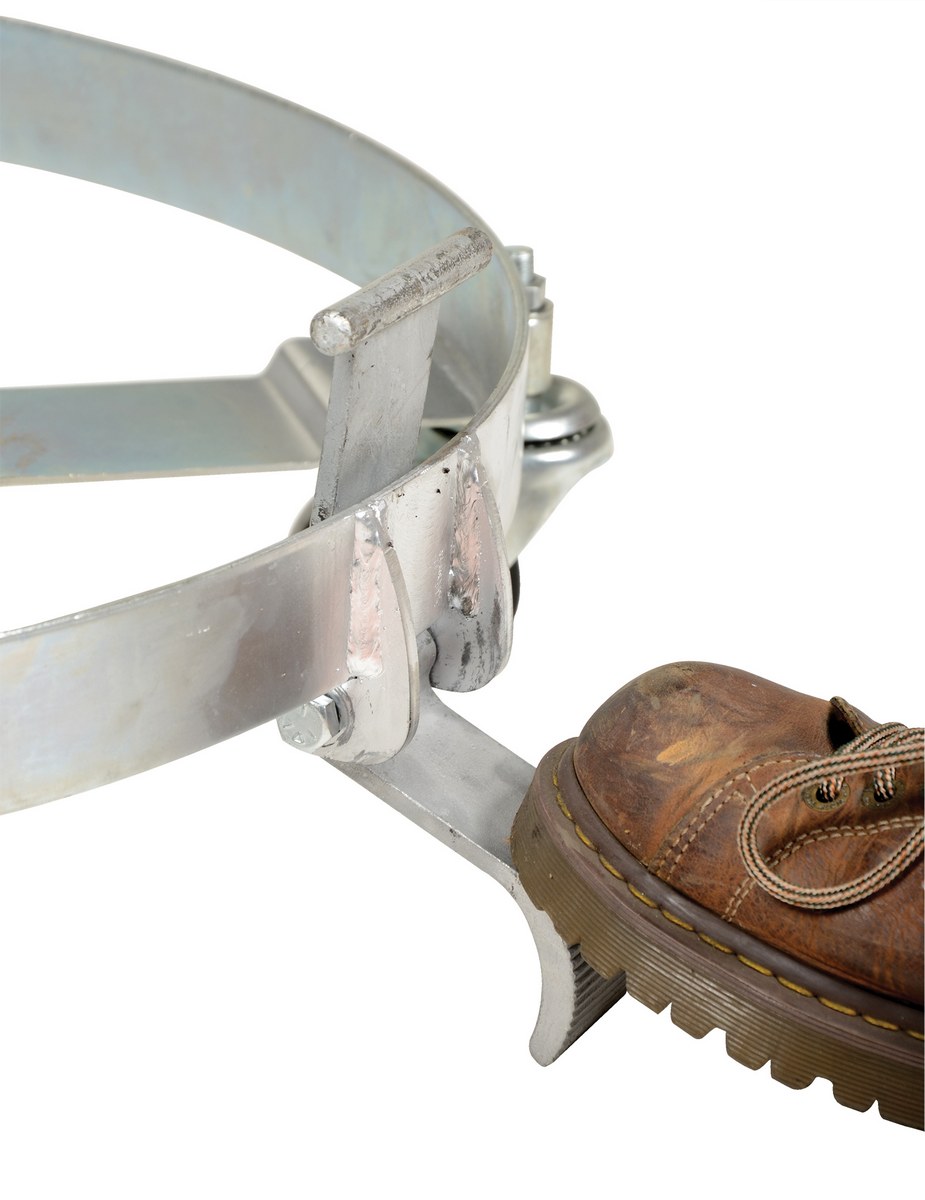 Tilting drum dolly tilts for better liquid extraction. Fits onto a variety of round steel drums. Tilting feature is foot-operated and locks into place when activated. This feature only works with the outside/biggest drum that the unit will accommodate. Patent pending.