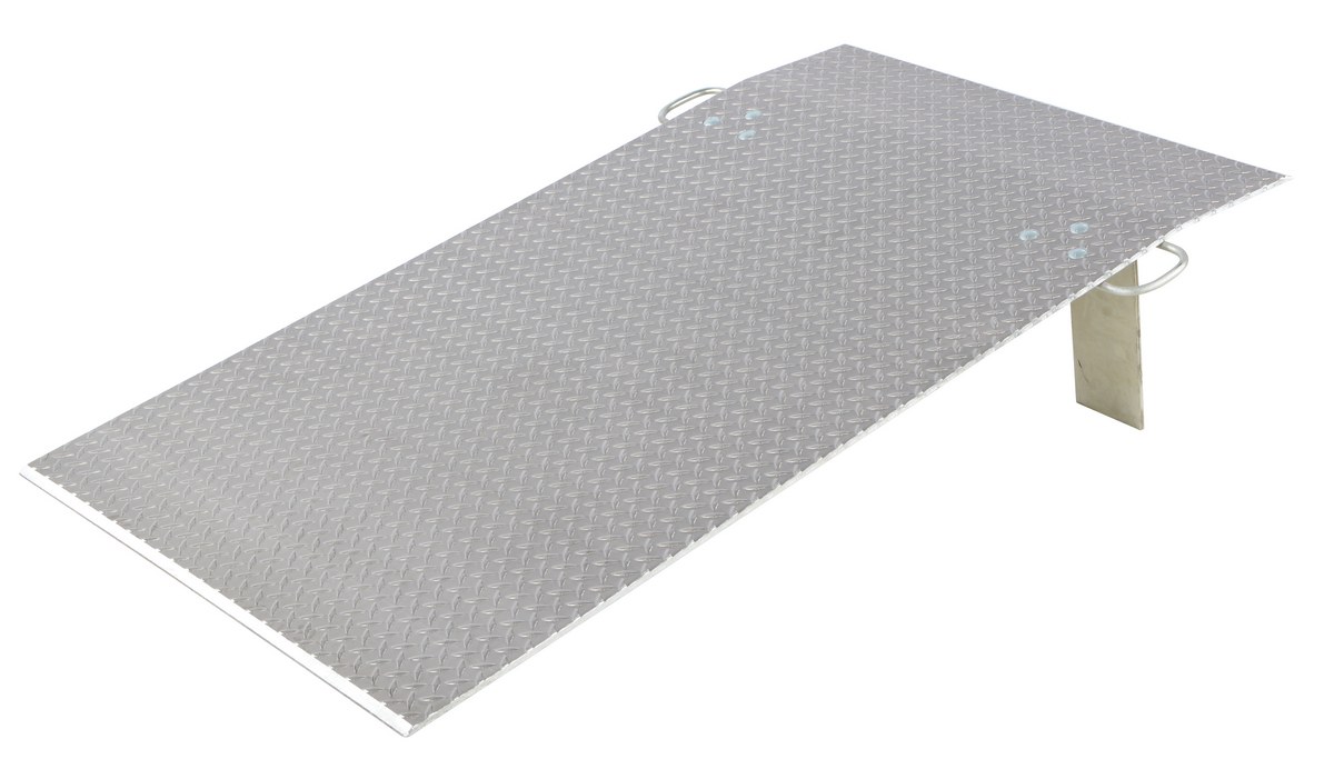 The aluminum economizer dock plate is an economical way to speed up truck loading and unloading. The unit spans the opening between dock and trailer to allow pallet or hand trucks along with traffic to safely move in and out of the trailer. The dock plate is constructed of high strength, non-skid aluminum alloy tread plate. The lightweight design with bolt on zinc plated legs and handles on each side makes portability easy. Locking legs for OSHA compliance. Not for use with fork trucks.