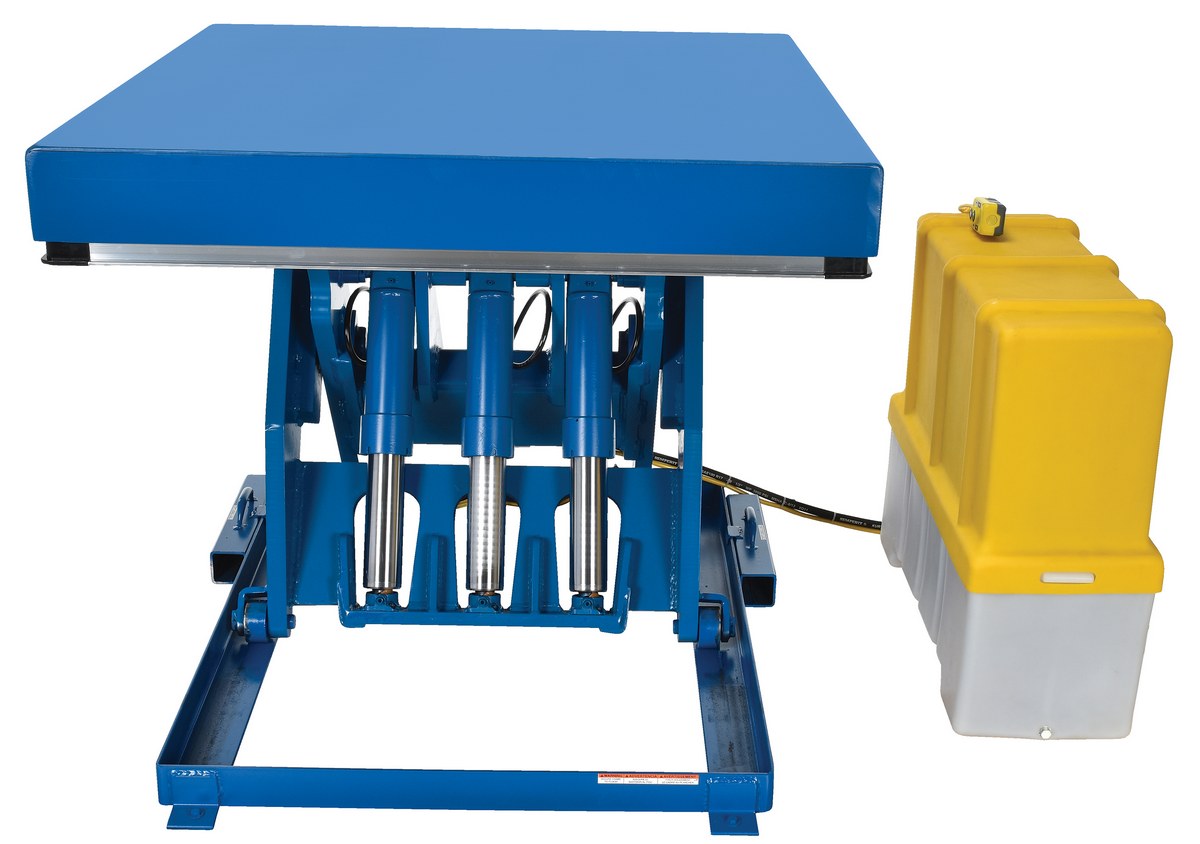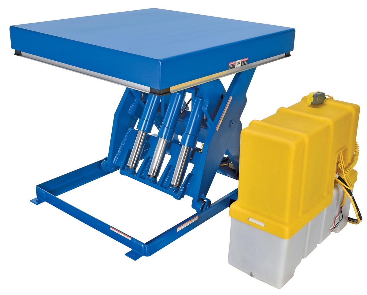 The electric hydraulic scissor lift table is used by all types of manufacturing and warehouse facilities. Safety features include a patented pinch point perimeter toe guard to protect pinch points while lowering the table, fused push button control, internal safety velocity fuse to maintain platform height in the event of hose or fitting failure, integral maintenance prop, adjustable upper travel limit switch to stop the table at maximum height, and displacement-style hydraulic cylinders for maximum strength. It also features a pressure plated pump, manifold system, and state-of-the-art lifetime lubricated bearings. The standard 56 frame electric motor is fully enclosed with additional voltage options available. Contact factory if platform dimensions are crucial.