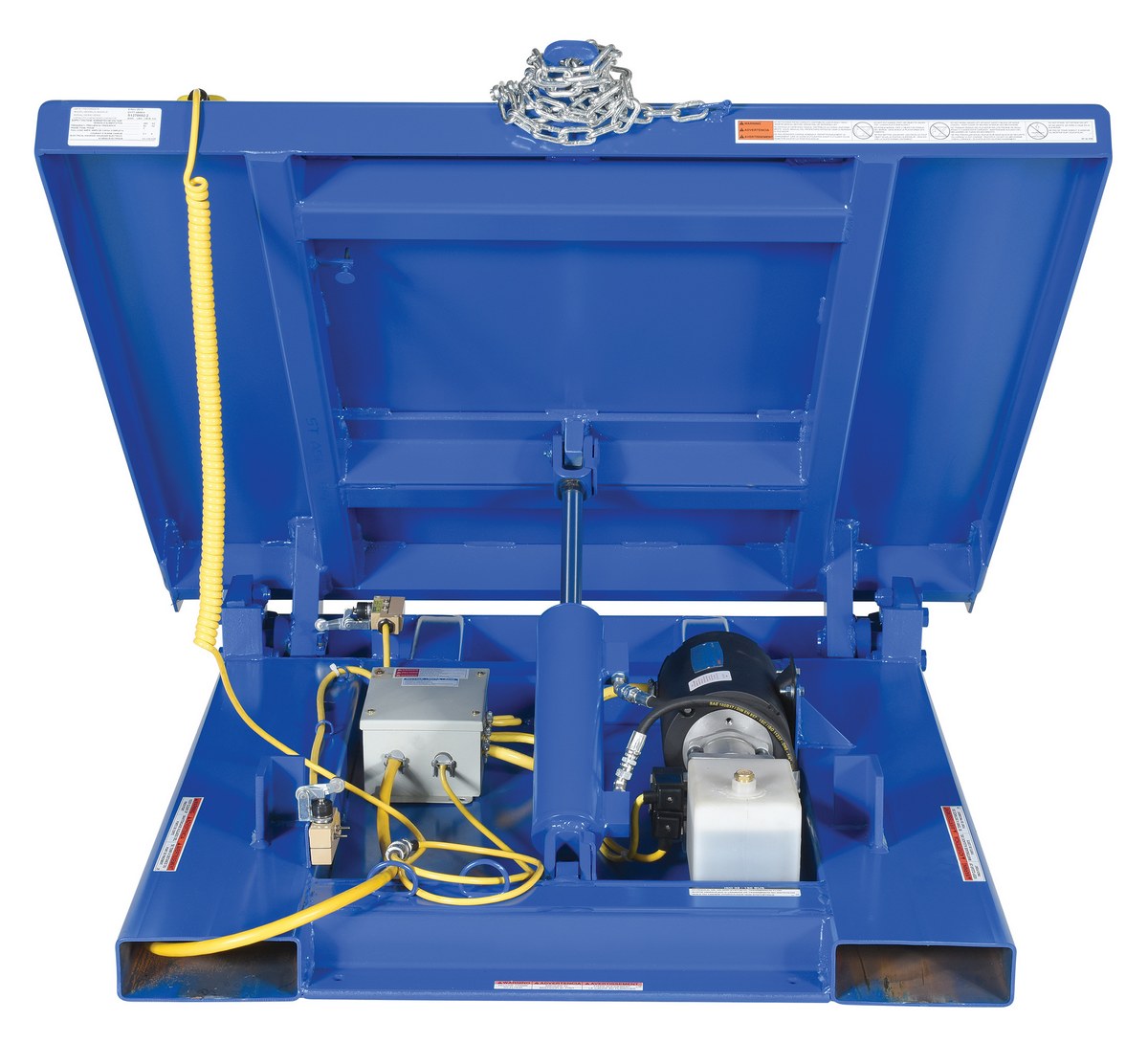 The hinge tilt table offers the rugged durability of the standard efficiency master line of tilters, plus they offer an extra platform height. The lip design allows for loading and unloading on three sides. This tilt table has a two-button handheld pendent control with additional voltage options available. The pressure plated pump is coupled to an application specific manifold that features counterbalanced valves and modulated flow control for maximum efficiency.