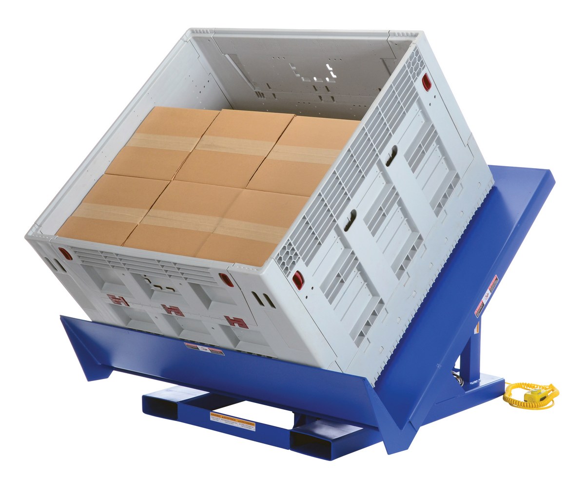The efficiency master tilt table tilts pallets, crates, boxes, or baskets to facilitate easy container loading or unloading. The table features all welded steel construction for years of durability. The unique design minimizes pinch points to meet OSHA requirements. This tilt table is equipped with an industrial quality motor that delivers the best torque with minimal amperage draw for maximum life. Standard voltage is 460/3PH, with additional voltage options available. The tilt table has a standard push button hand control. Base includes fork pockets for portability with forklift.