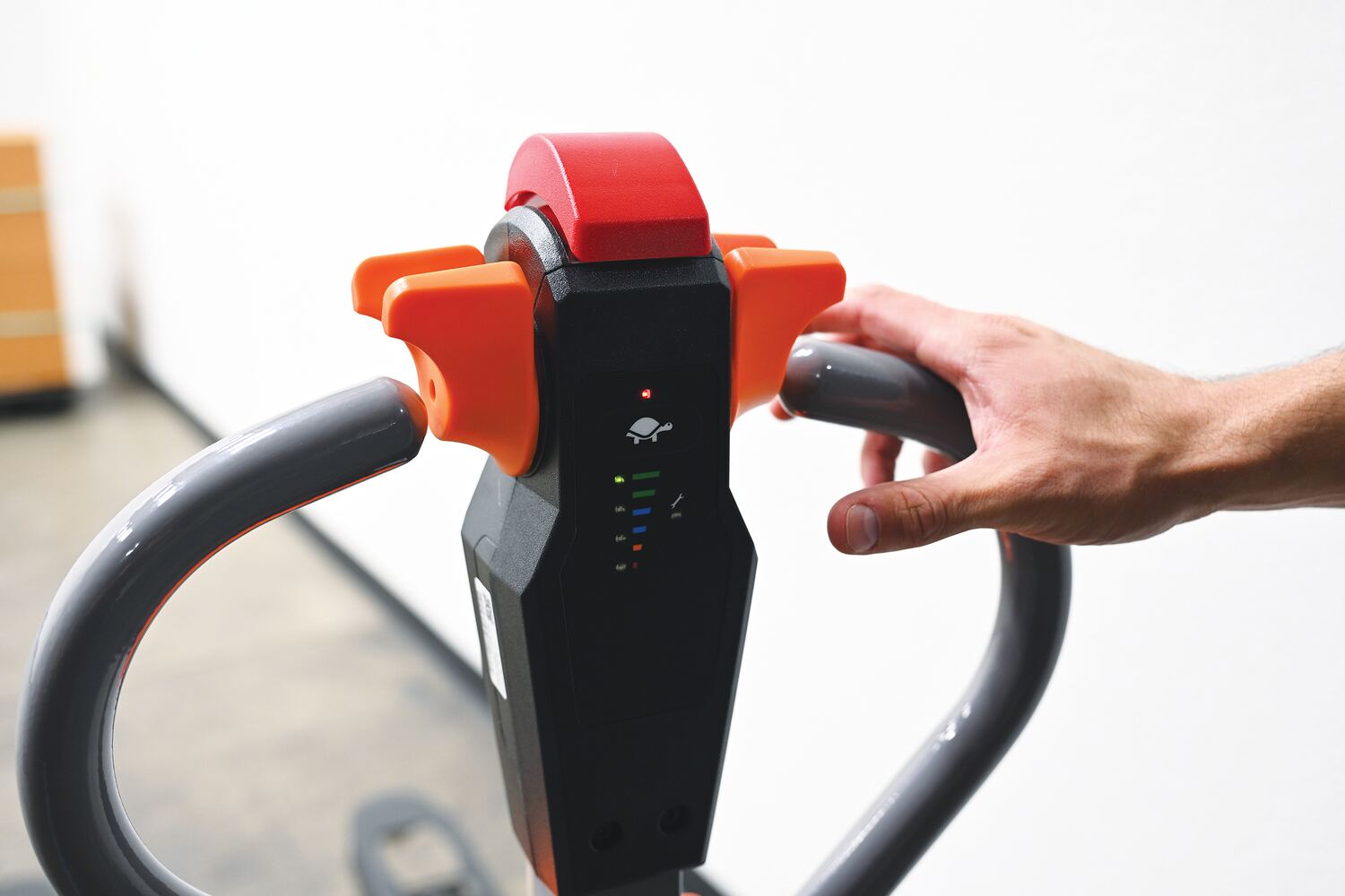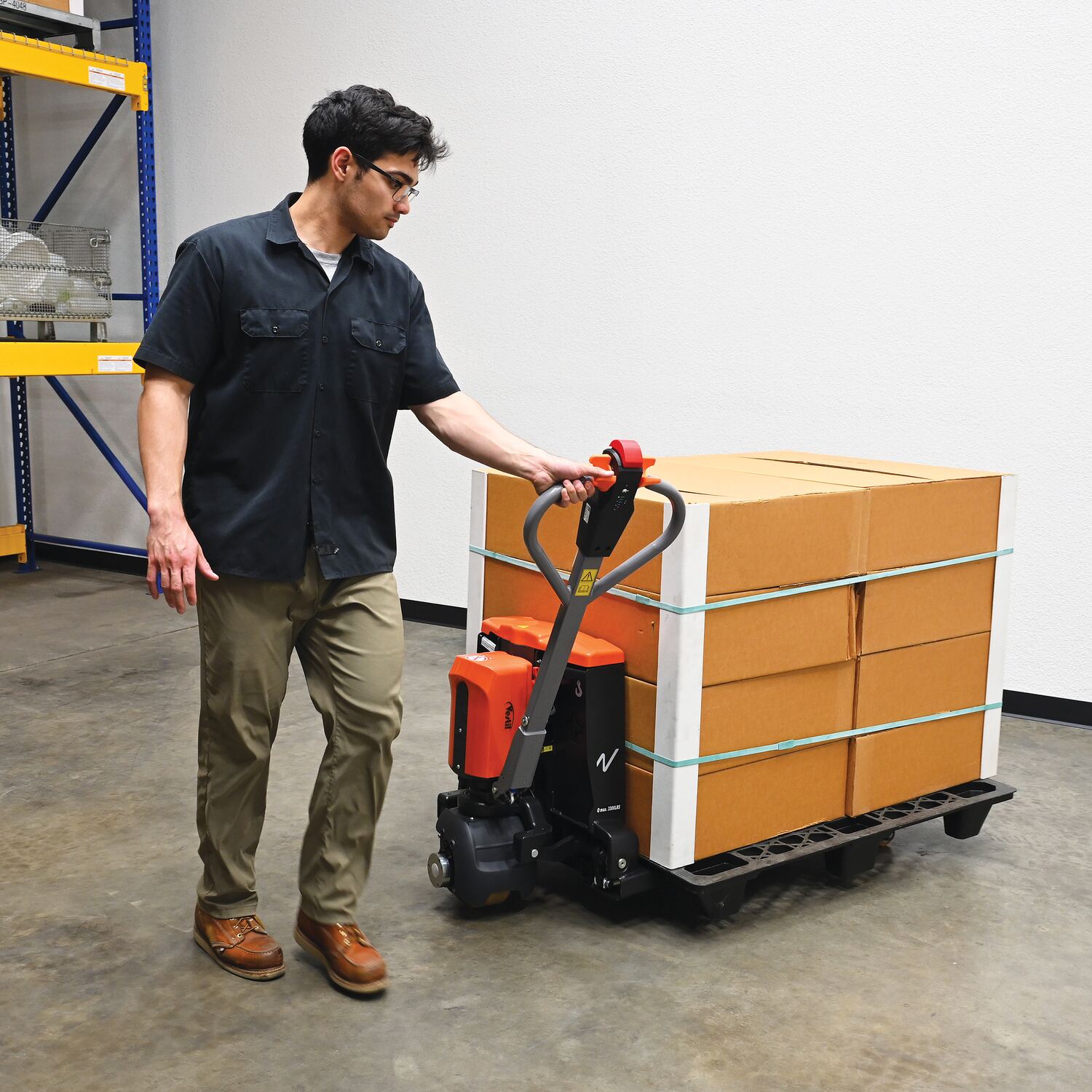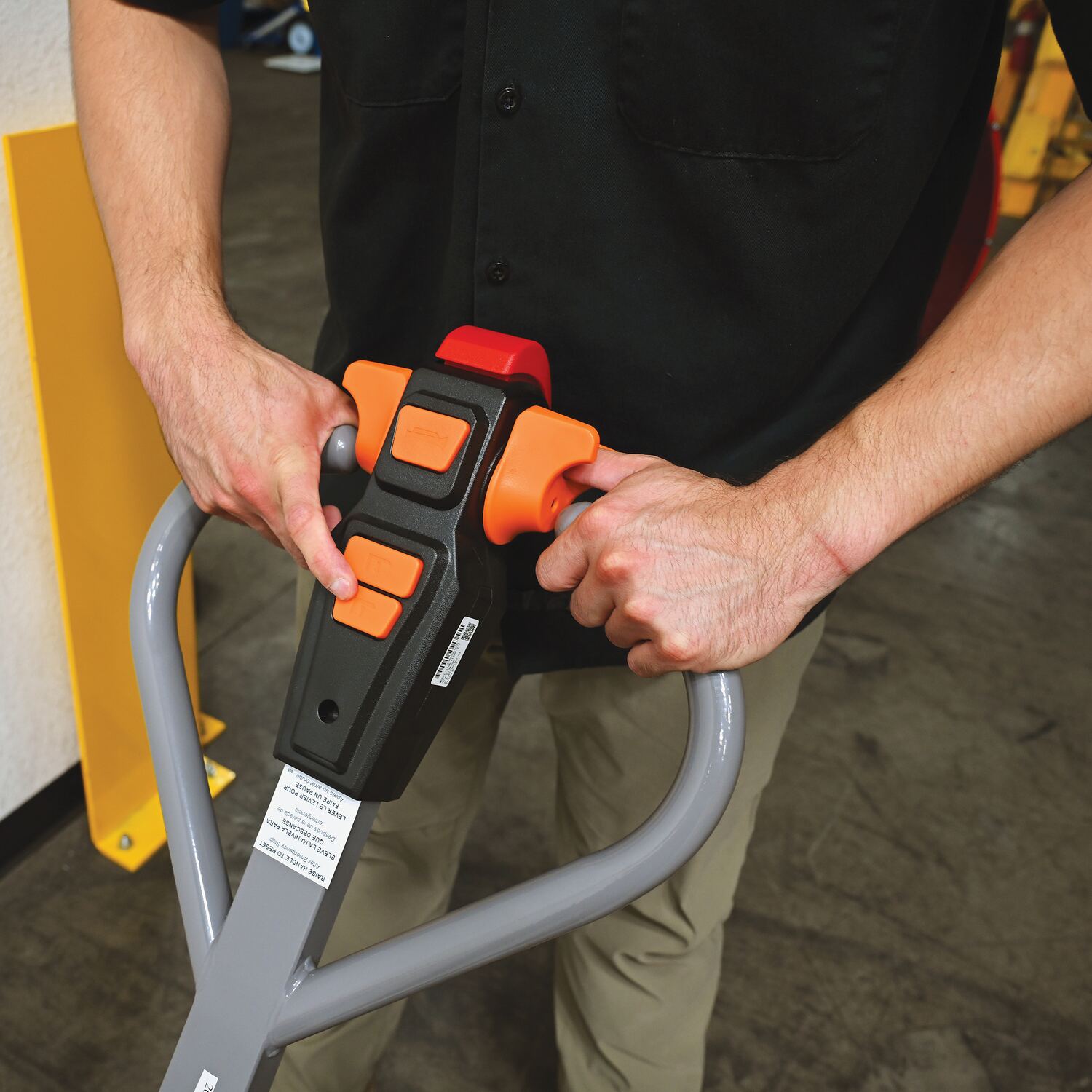 The electric pallet truck is the perfect change from the manual design. This construction design is built to last, withstand rugged daily use, and diminish manual labor. Multi-function capabilities such as the raise and lower buttons and emergency brake are located in the handle. The design of the handle is also ergonomically friendly, minimizing awkward slouching when maneuvering. All areas are easily accessible for general upkeep and cleaning. Truck can be used with the handle in the upright position for utilization in the small areas. Horn is also included. This model includes powered brakes, which lessens strain on workers and increases workplace safety.