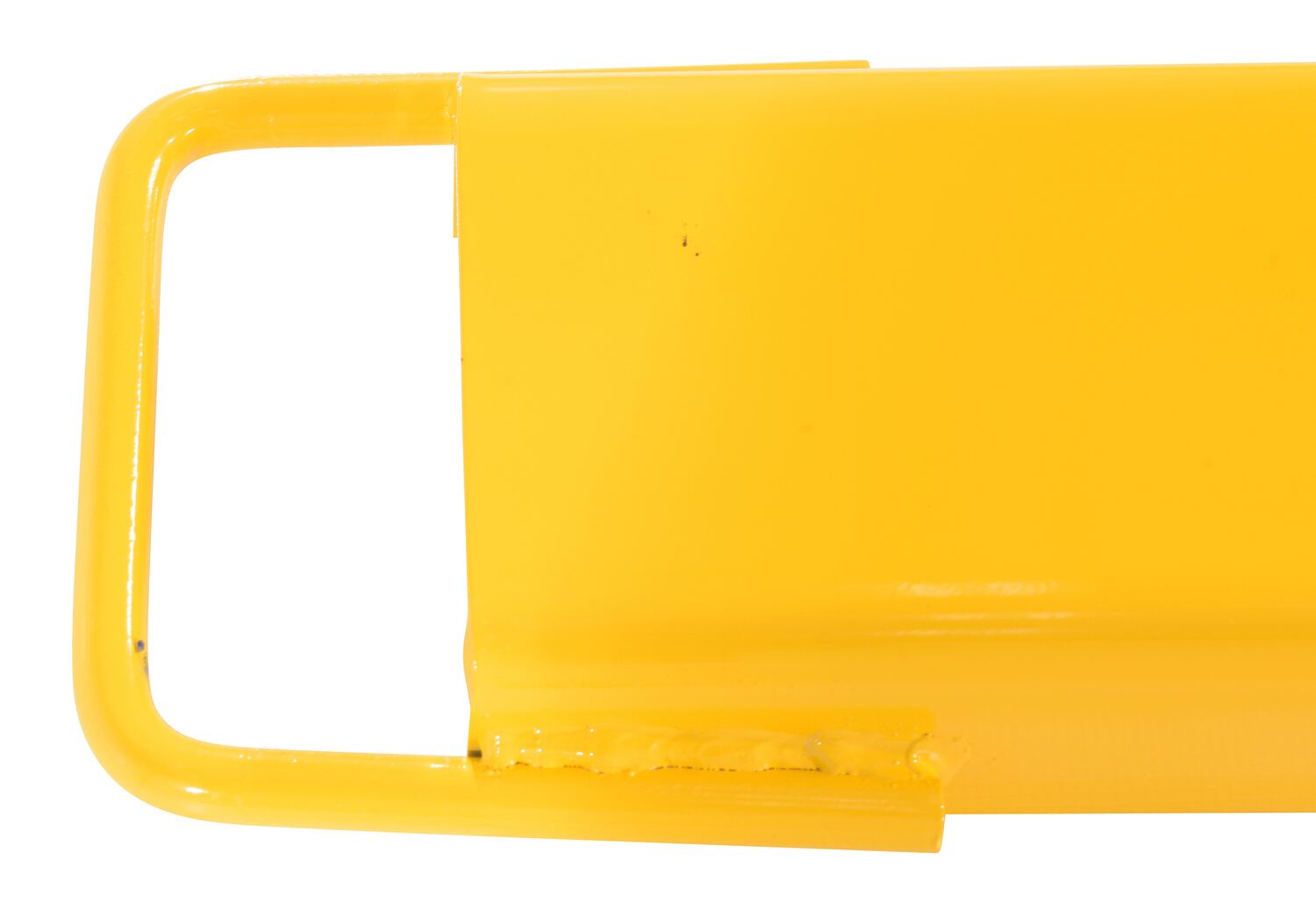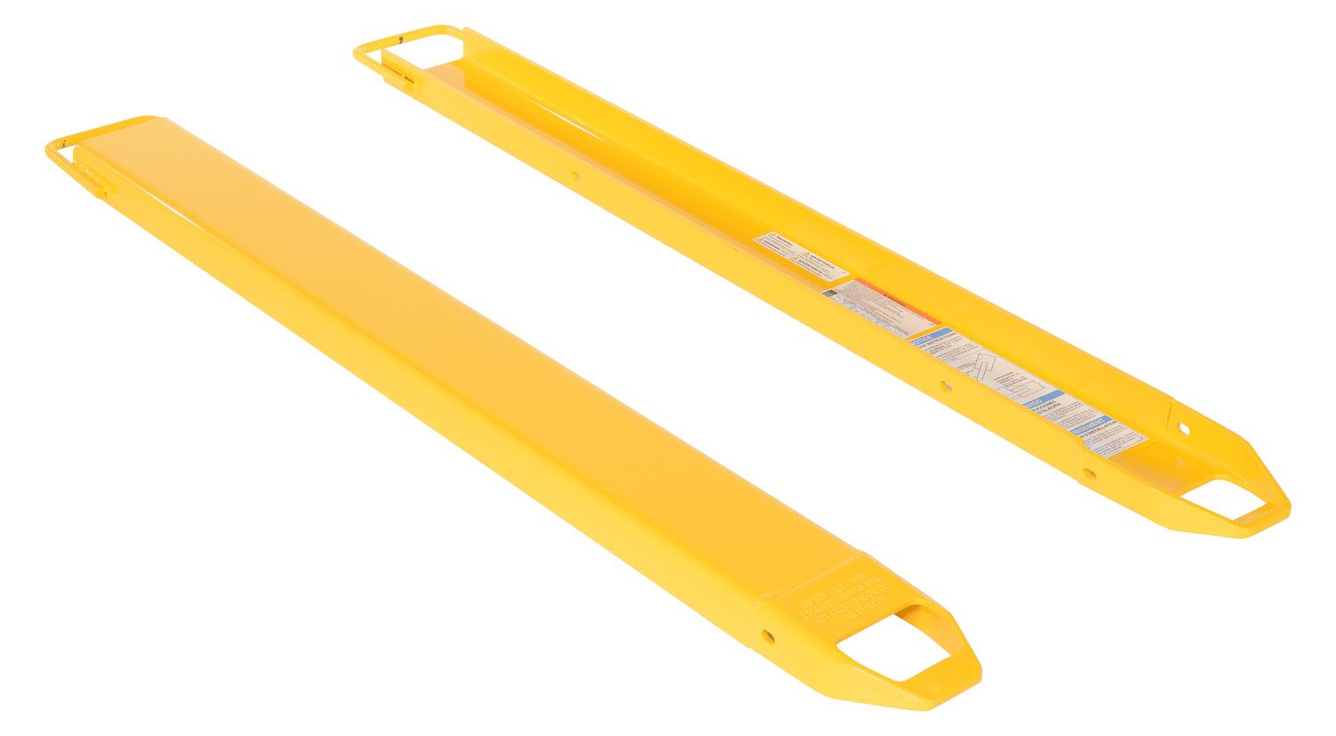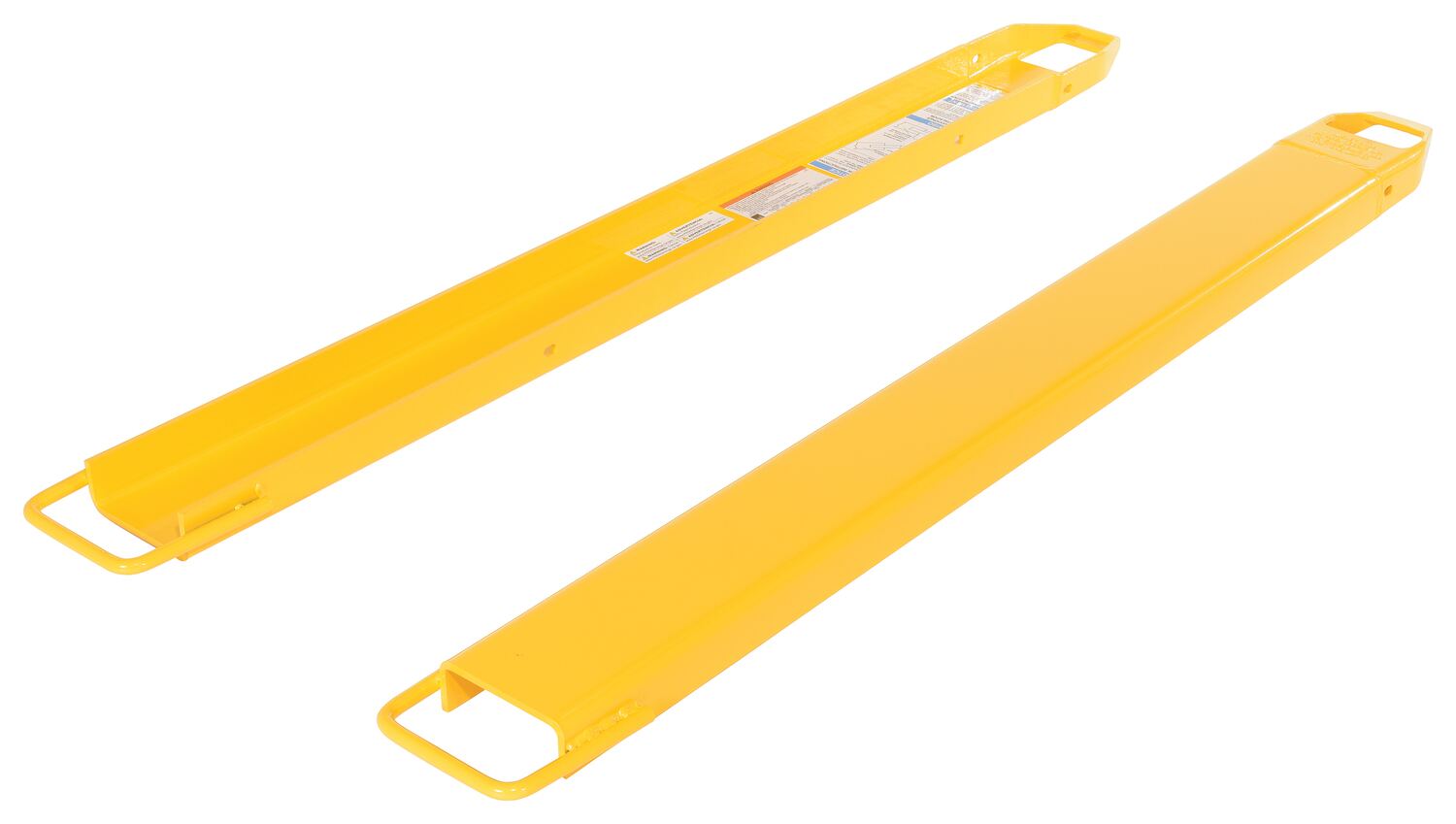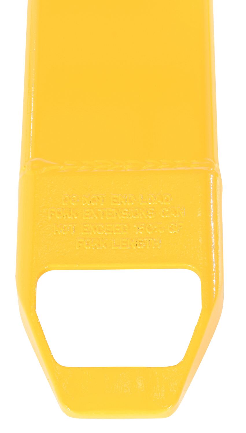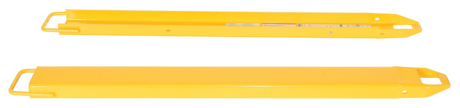 Provide the extra support needed to lift long or large objects with a fork truck using a pair of fork extensions. Welded steel construction with cast steel tips. Steel retaining strap prevents fork extensions from sliding off forks during use. Powder coat yellow finish. OSHA regulations require that extensions are no more than one-hundred and fifty (150) percent of the existing fork length. Insert loop at the tip of the fork and slide it up at a forty-five (45) degree angle. Then, lay it down over the existing fork. To be used with class 2 and class 3 forks only.