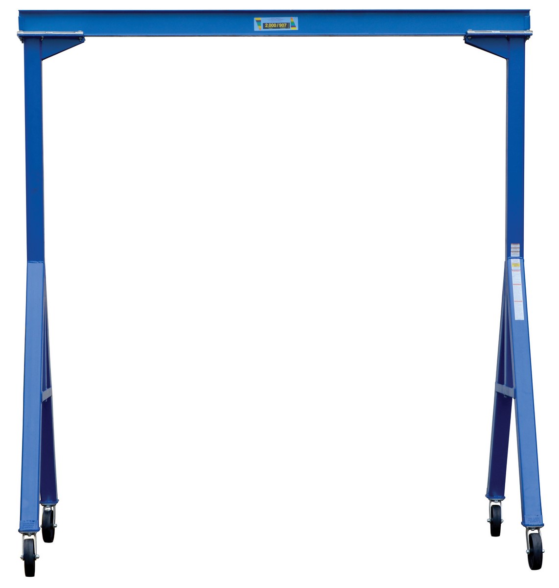 Steel Fixed Gantry Crane with Glass Filled Nylon Casters 10 Ft. 2000 Lb. Capacity BlueThe fixed height steel gantry crane is designed for transporting and positioning materials along the beams length. The solid steel construction will provide years of service, while the painted blue finish will keep the models protected from surface ware. The rigging locks in 1 of 4 positions; you can set the wheels and push the gantry crane forward, back, left or right. The unit is an economical and efficient way to lift and raise products, diminishing the need of additional personnel. The fixed height design allows for constant use in a particular setting without the need to maneuver the overall height of the unit.