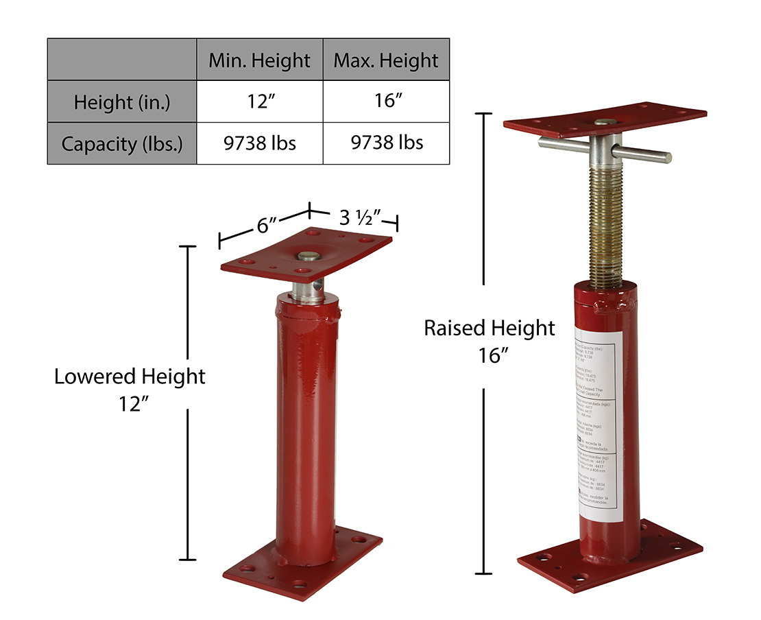 | Height Minimum/Maximum (in.): 12 to 16 | Capacity at 12" (lb.): 9,738 | Capacity at 16" (lb.): 9,738 |