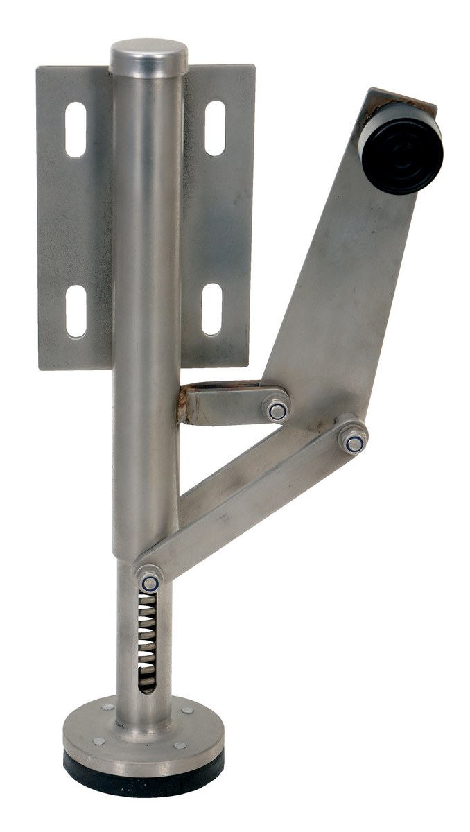 A general purpose Floor Lock may be used on platform trucks, fixture dollies, or equipment with casters. Lock is activated when you use your hand to lower the large friction face against the floor. To release, simply release the rod by hand. Brake is independent of casters and can be installed to any convenient location on the cart. Vertical mounting plate designed to mount to sides of carts and other portable products. The spring loaded pad accommodates uneven floors. Unit mounts with pad off the floor when retracted.