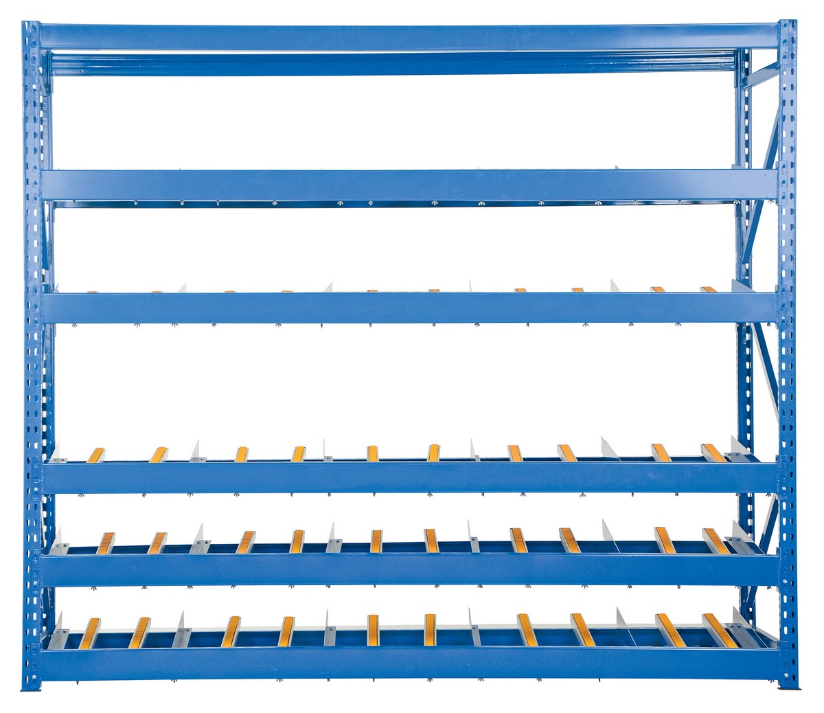 With the carton Flow Rack, cartons are gravity fed on rollers for convenient first in - first out stock rotating. Choose the quantity of levels that best fits your application. Each level includes four (4) pairs of rollers and each level also includes five divider sections. Units can be bolted together for additional depth.