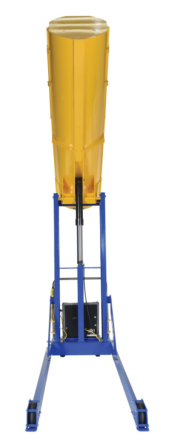 Steel DC Powered Portable Hydraulic Drum Dumper 72 In. Dump Height 1,500 Lb. Capacity Blue / YellowThe Hydraulic drum dumper is what you need to dump heavy drums. Works with plastic, steel, and fiber drums. Dumper has a solid steel chute. this portable unit has casters with floor lock screws. Upper travel limit switch, emergency brass safety velocity fuse in cylinder are standard. All steel construction.