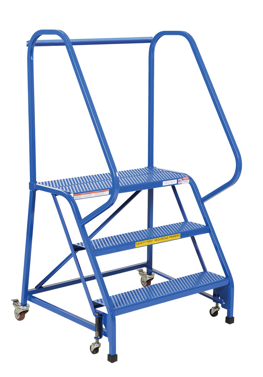 The standard slope ladder is a portable warehouse ladder for every-day use applications. Perforated steps, handrail included and welded square tubular steel construction with powder-coat blue finish. Rubber feet provided for floor protection. Unit has (2) two all directional spring-loaded swivel casters and (2) swivel casters with total locks. Ships fully assembled and ready to use.