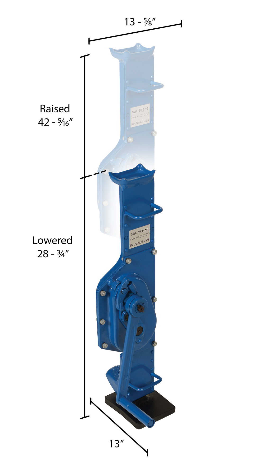 Mechanical Machinery Jack 13 In. x 13-5/8 In. x 42-5/16 In. 10,000 Lb. Capacity BlueThe mechanical machinery jack is good for repairing vehicles, lifting trucks, railway maintenance, construction, mining, and agriculture. Compact design with collapsible lever offers easy operation and simple maintenance. A self locking, anti-kickback operating lever reduces injuries. Standard features include: folding handle, two carrying handles and a large base plate. Lifting and lowering speed is controllable. No seals to leak. Will not drift down even after an extended period of time.