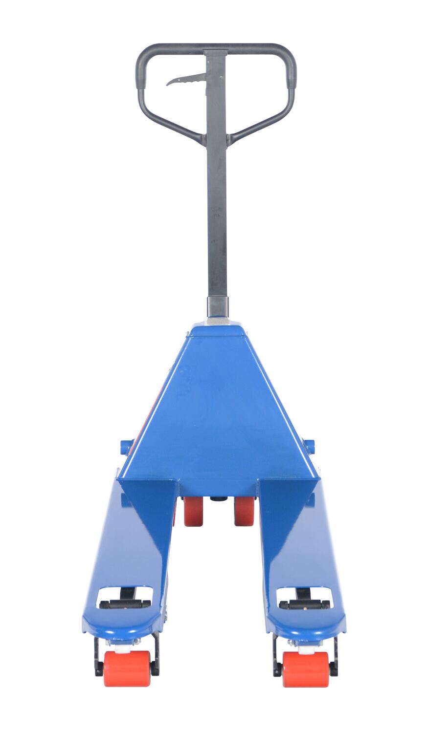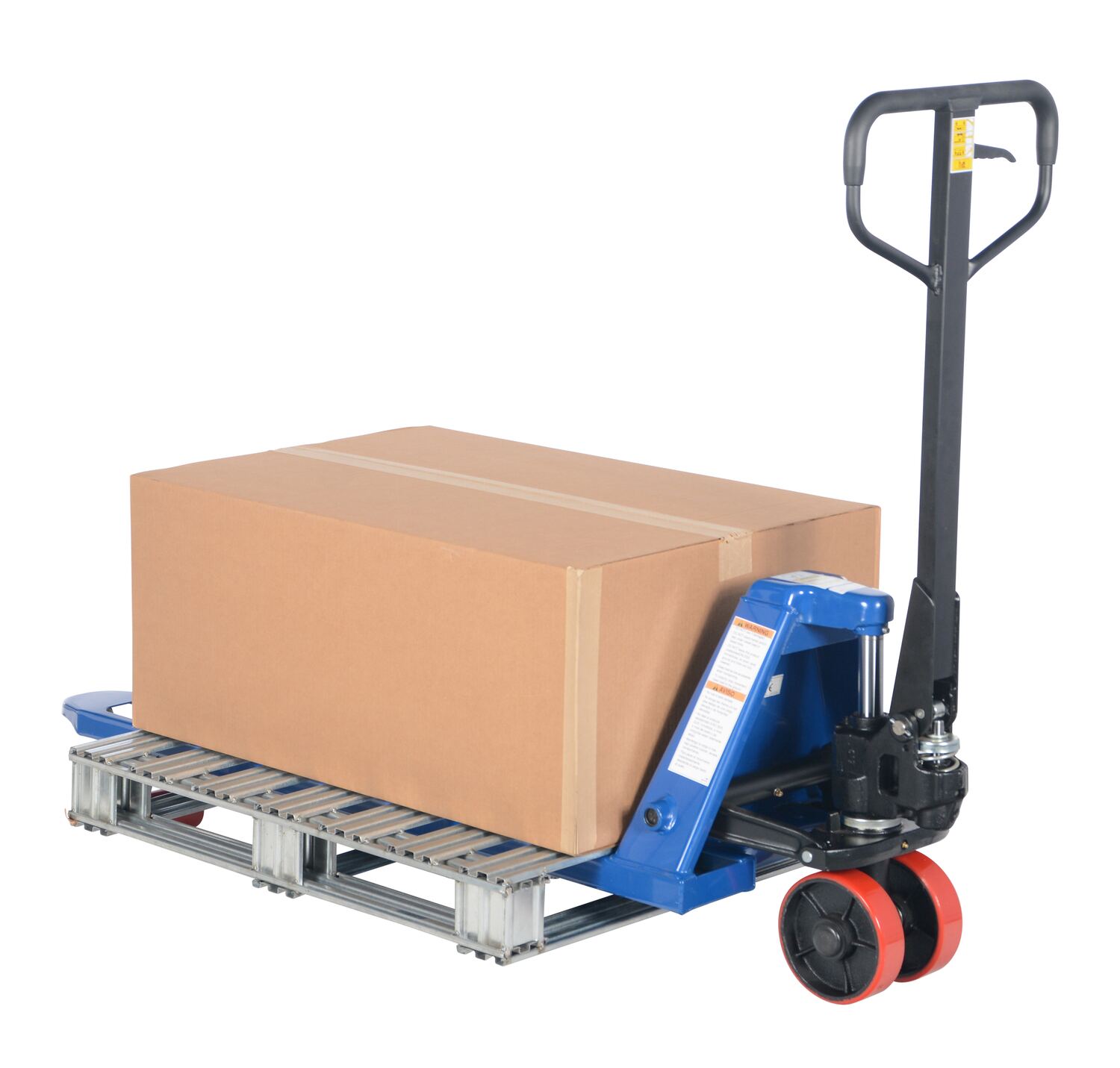 The quick lift pallet truck lifts to a maximum height with just five to six (5-6) pumps. It reduces operating cost and is an economical way for one person to move heavy pallet loads without the use of a fork truck! Includes two (2) articulating steering wheels and two (2) front load rollers. The ergonomic design requires only seventy-five (75) pounds of pulling force when fully loaded. The steering wheels include bearing dust covers for added life. Nose wheels are located on the front edge of each fork to assist in clean pallet entrance and exit. Reinforced triple-formed steel forks provide twice the strength of standard single-formed forks. The unit is equipped with internally mounted solid steel adjustable push rods. Spring loaded handle automatically returns to vertical position when not in use. The hydraulic pump design facilitates easy access seal replacement. The chrome-plated hydraulic pump piston ensures long seal life.