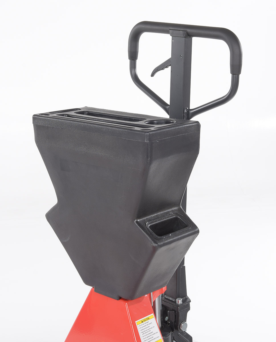 Steel/Plastic Pallet Truck 61-3/16 In. x 20 In. x 48 In. 5500 Lb. Capacity Red with Black P-CaddyA pallet truck with a storage caddy is the perfect bundle of two innovative products. The pallet truck has an ergonomically friendly design with a limited pulling force required, while the caddy allows the user to be more organized and efficient. With a strong powder coated steel construction, the pallet truck moves easily between areas. Nose wheels are located on the front edge of each fork to assist in clean pallet entrance and exit. A molded plastic design allows the caddy to be durable throughout consistent daily use. Installation hardware and instructions included.