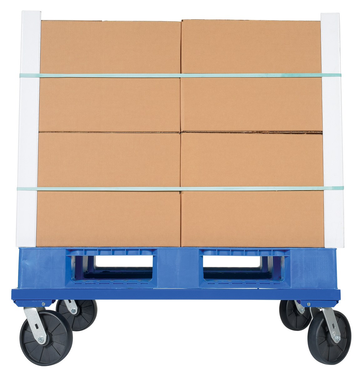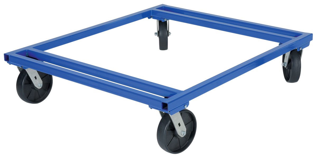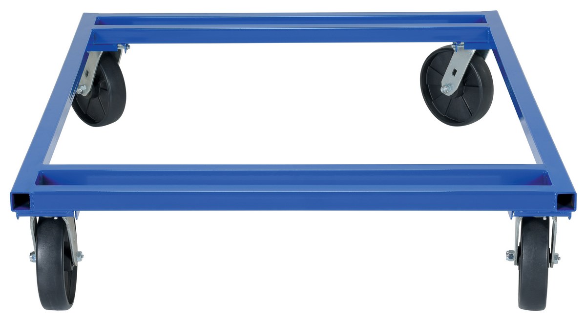 This steel pro-mover moves pallets without a fork truck or pallet jack. Designed for holding standard wooden pallets. Transport pallets and skids with this open frame all welded steel dolly. Unit rolls smoothly on casters bolted to the dolly. Blue powder coat finish.