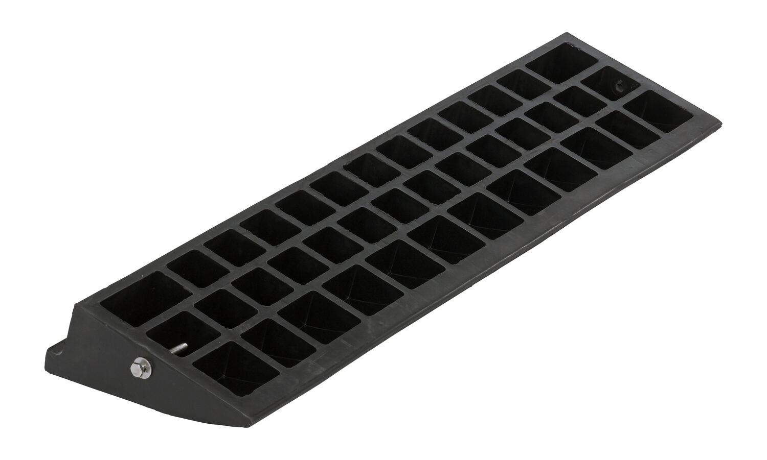 Heavy Duty Rubber Corner Ramp Rectangular 9-11/16 In. x 35-3/8 In. x 3-5/8 In. 4000 Lb. Capacity BlackThe rubber ramp consists of modular rubber that is versatile for use in many applications. Add round corner piece (sold separately) for a finished look. Tread surface pattern for better traction. Includes hardware for connecting ramps together. Heavy-duty molded rubber construction.