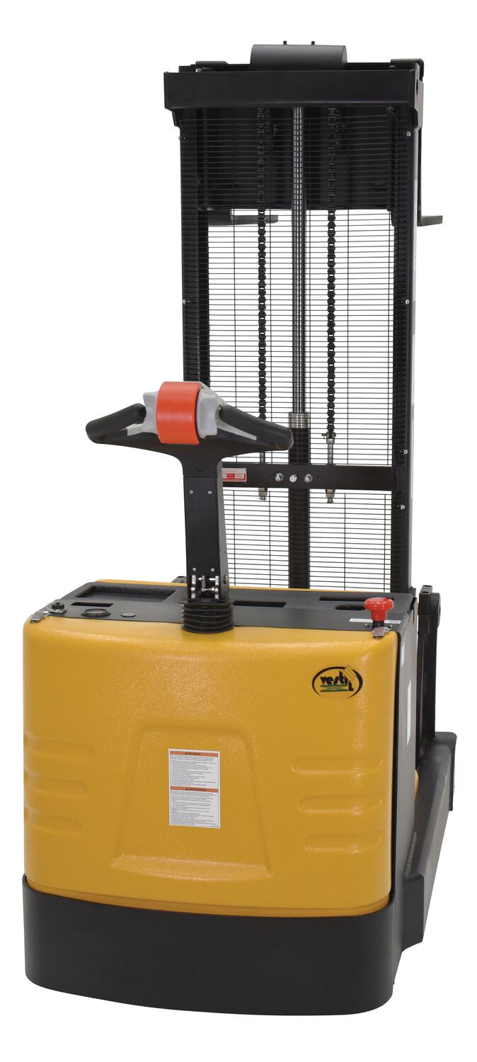 The counter-balanced power drive lift is ideal for die loading, machine feeding, and for loading and unloading trucks. The high torque drive and lift motor handles heavy-duty jobs. The ergonomic handle features an easy-to-operate throttle with infinite adjustment of forward and reverse speeds, lift/lower controls, proprietary safety-enhancing emergency reverse function, and horn. When the proprietary safety-enhancing emergency reverse function is actuated, the emergency reverse belly switch instantly reverses direction and moves the unit forward (away from the operator) until the switch is released or after five (5) seconds have elapsed. The built-in safety circuit will automatically disable the entire unit if the emergency reverse belly switch is activated for more than five (5) seconds after which the unit must be re-set to return to normal operating conditions. This state-of-the-art safety device provides a high degree of operator protection. Includes an electromagnetic disc brake with automatic dead-man feature that activates when the user releases the handle. The powered lift has lead acid deep cycle batteries, an integral battery charger, and battery level gauge. The stacker rolls smoothly on poly-on-steel steer & load wheels. The high level of serviceability simplifies maintenance and prolongs equipment life. The forks adjust to suit different pallets and the easy access battery compartment simplifies battery maintenance. Horn included.