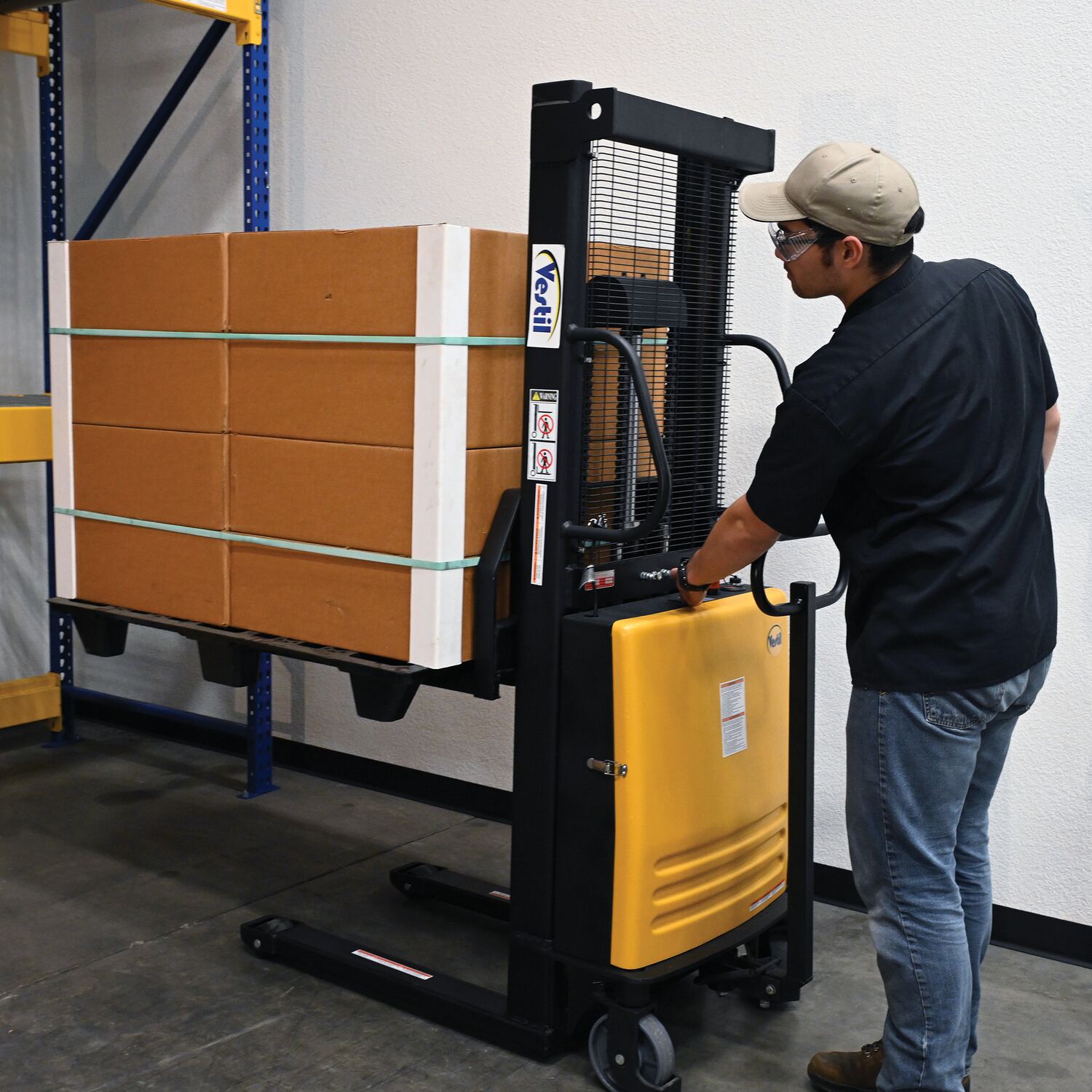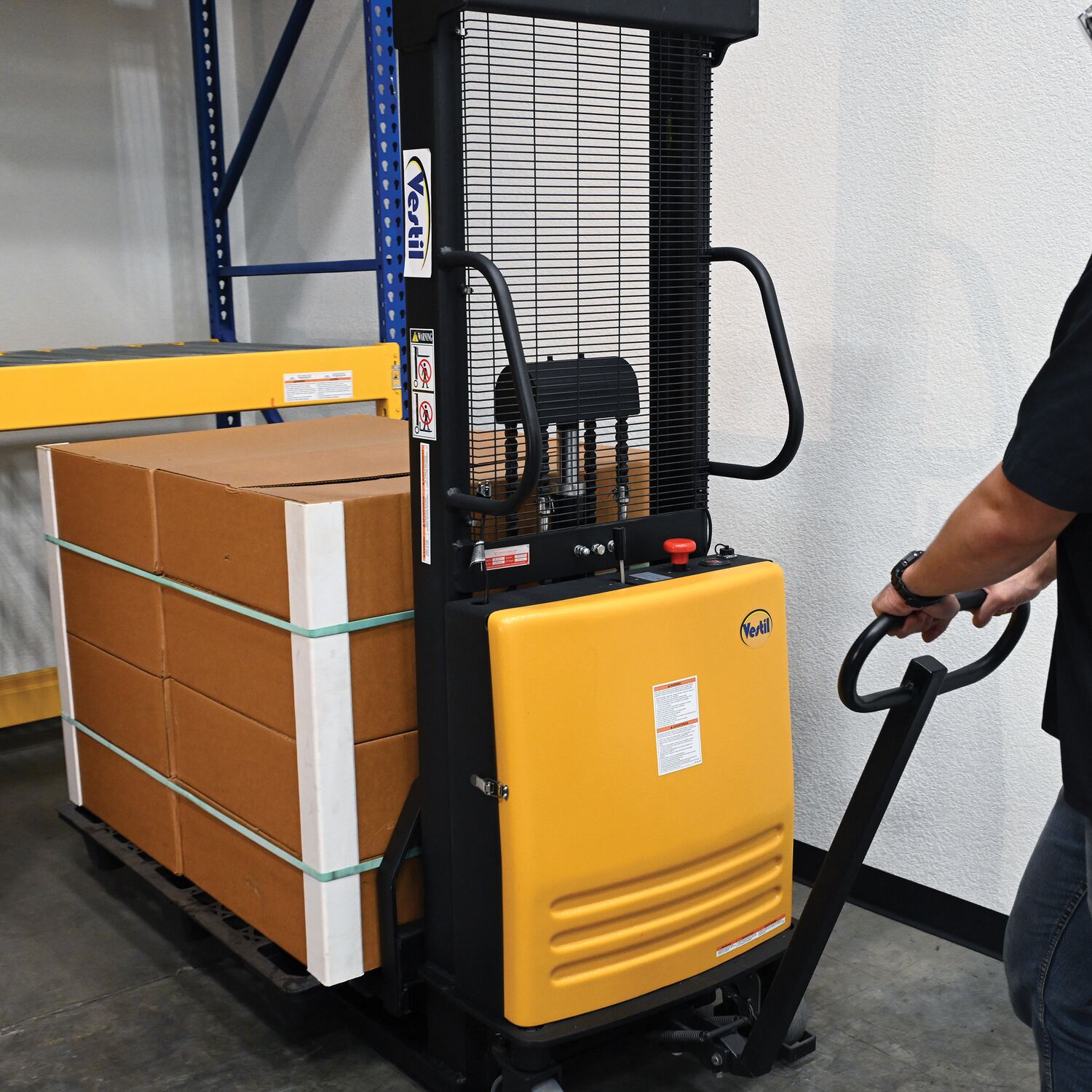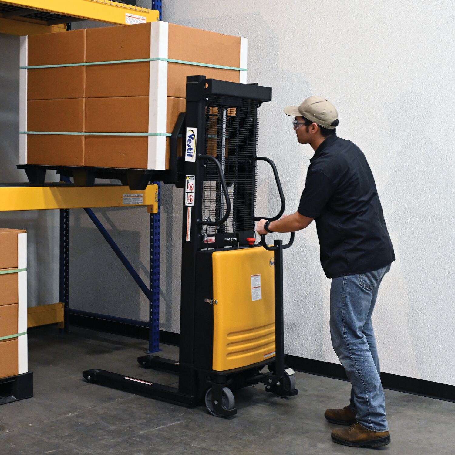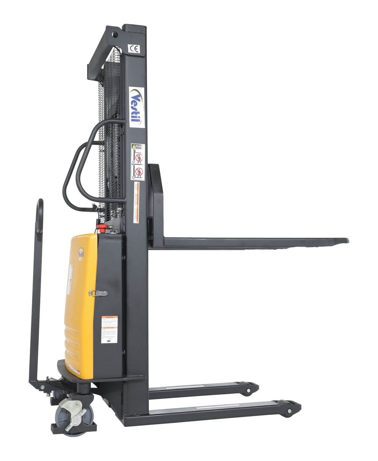 Steel Fixed Stacker with Powered Lift 63 In. Raised Height 2,000 Lb. Capacity Yellow