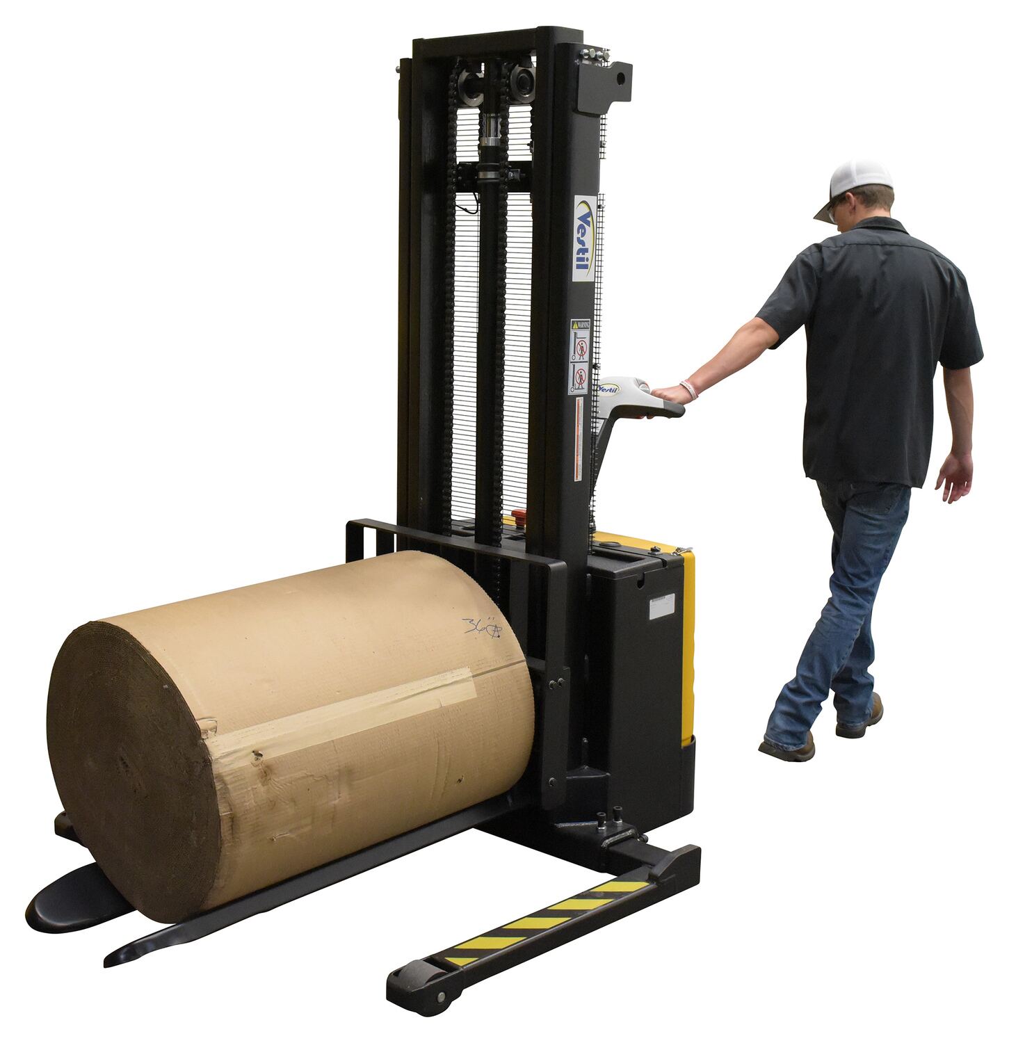 A roll fork is a wonderful accessory to the powered lift stacker. With a resilient design, the fork provides a more resourceful way to handle rolls. When the fork is in place and the roll is secured, the user is able to maneuver heavy rolls efficiently to the desired location.