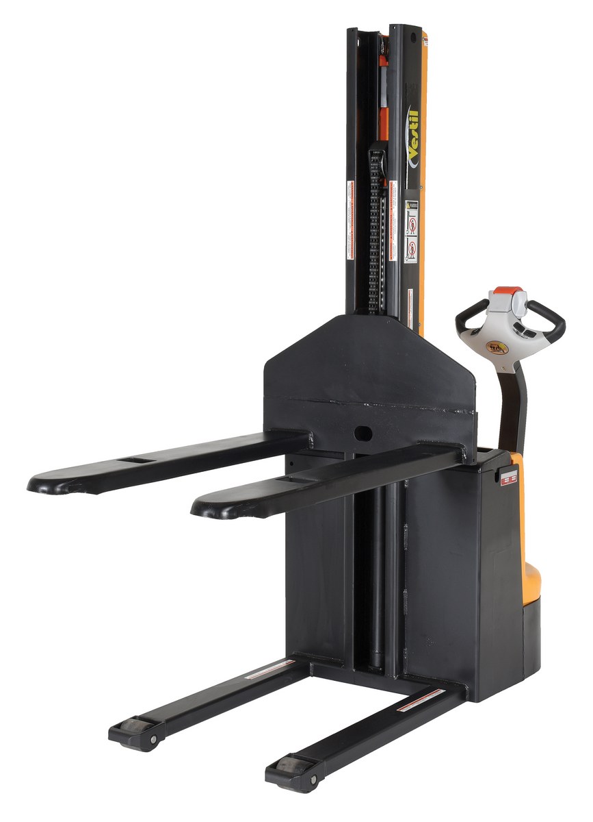 Steel Narrow Mast Stacker DC Powered 62 In. Raised Height Fixed Fork 27 In. Fork Width 1,500 Lb. Capacity Black / Yellow