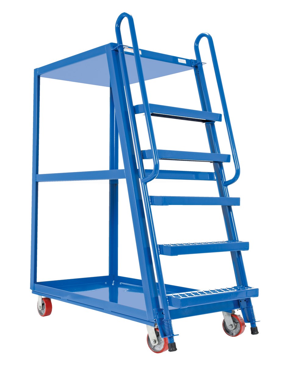 This oversized hi-frame stock picker truck is perfect for large jobs. Ideal for oversized cartons, boxes, parts, and supplies. A spring loaded steel ladder for sure, safe climbing, and loading. Steps have non-skid footing with self-cleaning surface. This stock picker truck has three (3) shelves. Built of durable steel construction. This unit is powder coated a blue finish.