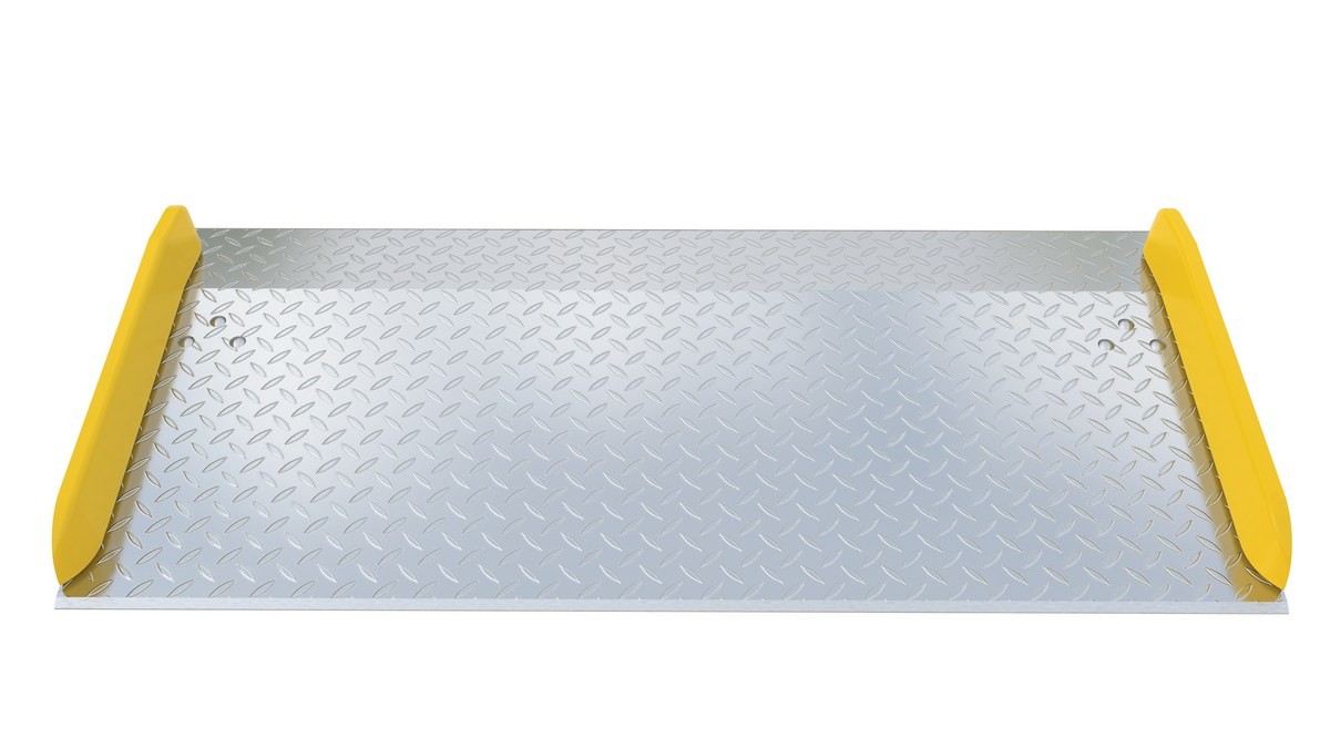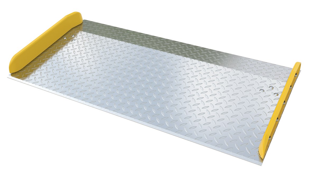 The Aluminum truck dock board with steel safety curbs is designed for portability and safety. The deck is made of tough high strength aluminum tread plate. The edges are beveled for smooth entry and exit. Safety curbs are coated yellow and are constructed of steel with cast tapered ends. Steel legs are bolted on for increased durability. Canted locking legs for easier truck portability. Manufactured in compliance with OSHA. The capacity is based upon the heaviest type of equipment used plus the maximum load carried times the single axle rating of total load. Dynamic loading, driver tendencies, speed and frequency of use must be considered. When using three-wheeled fork trucks order dock board with capacity at least four-times the lifting capacity of fork truck. The width of the dock board should be at least fifteen (15) inches wider than the load or equipment passing between the curbs. If the load does not pass between curbs, but is elevated above, add fifteen (15) inches to overall width of equipment.