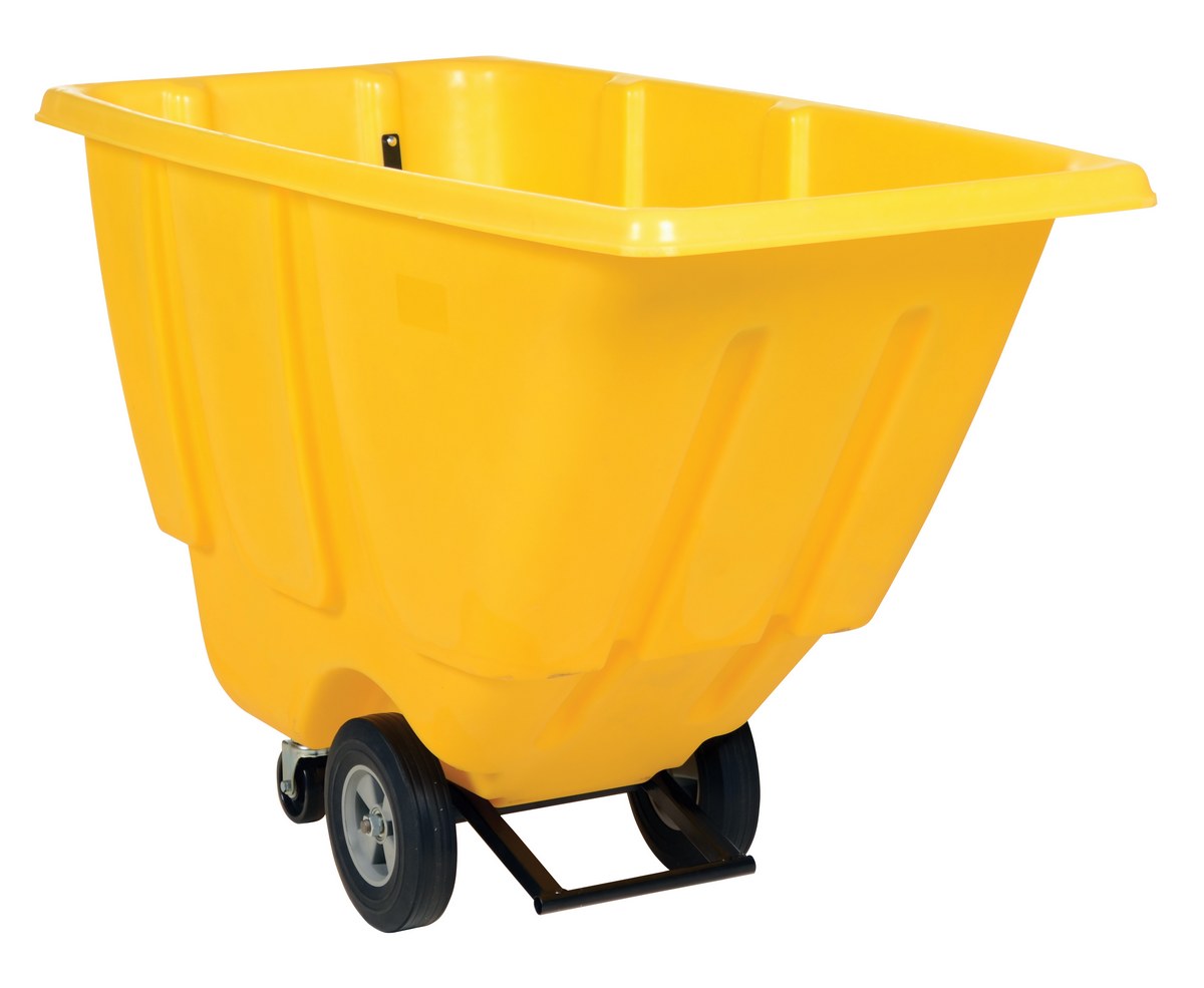 Durable plastic construction allows for collecting waste from multiple bins at a collective time. Great for warehouses, fairs, ball parks, schools, etc. Strong, one-piece molded polyethylene body with steel base tip support and a balanced design to allow for simple dumping by one person. Easily portable on 2 large rubber wheels and two swivel wheels. Not for use with fork trucks. Yellow color design.