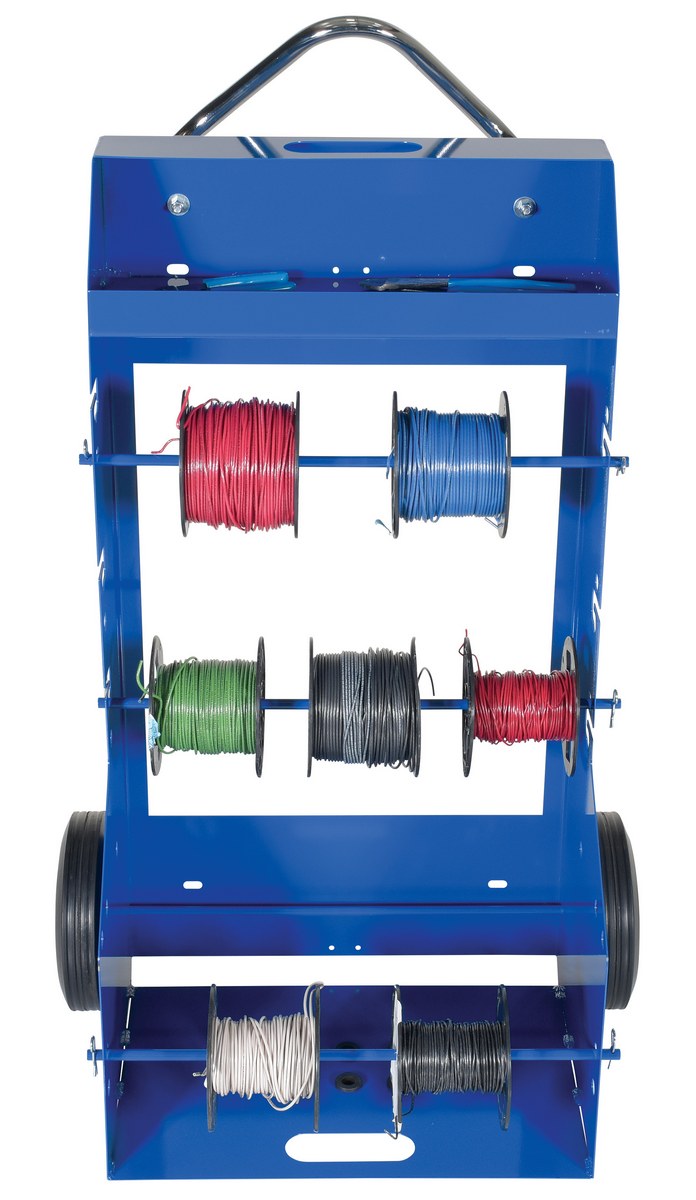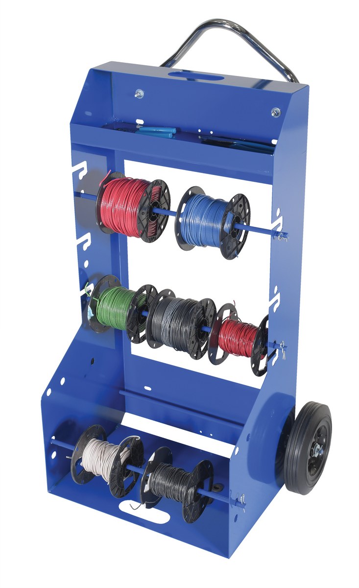 This portable wire reel caddy is designed to easily move wire reels where you need them the most. Dispense wire in vertical or horizontal position. Includes four (4) spool bars for handling various size reels. Bottom of caddy includes wire guide holes for quick access. Bolt-on push handle and casters for smooth ergonomic transporting.